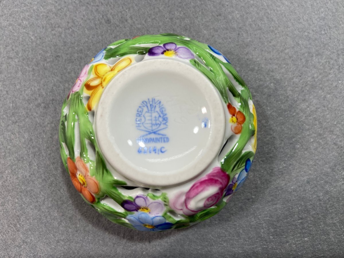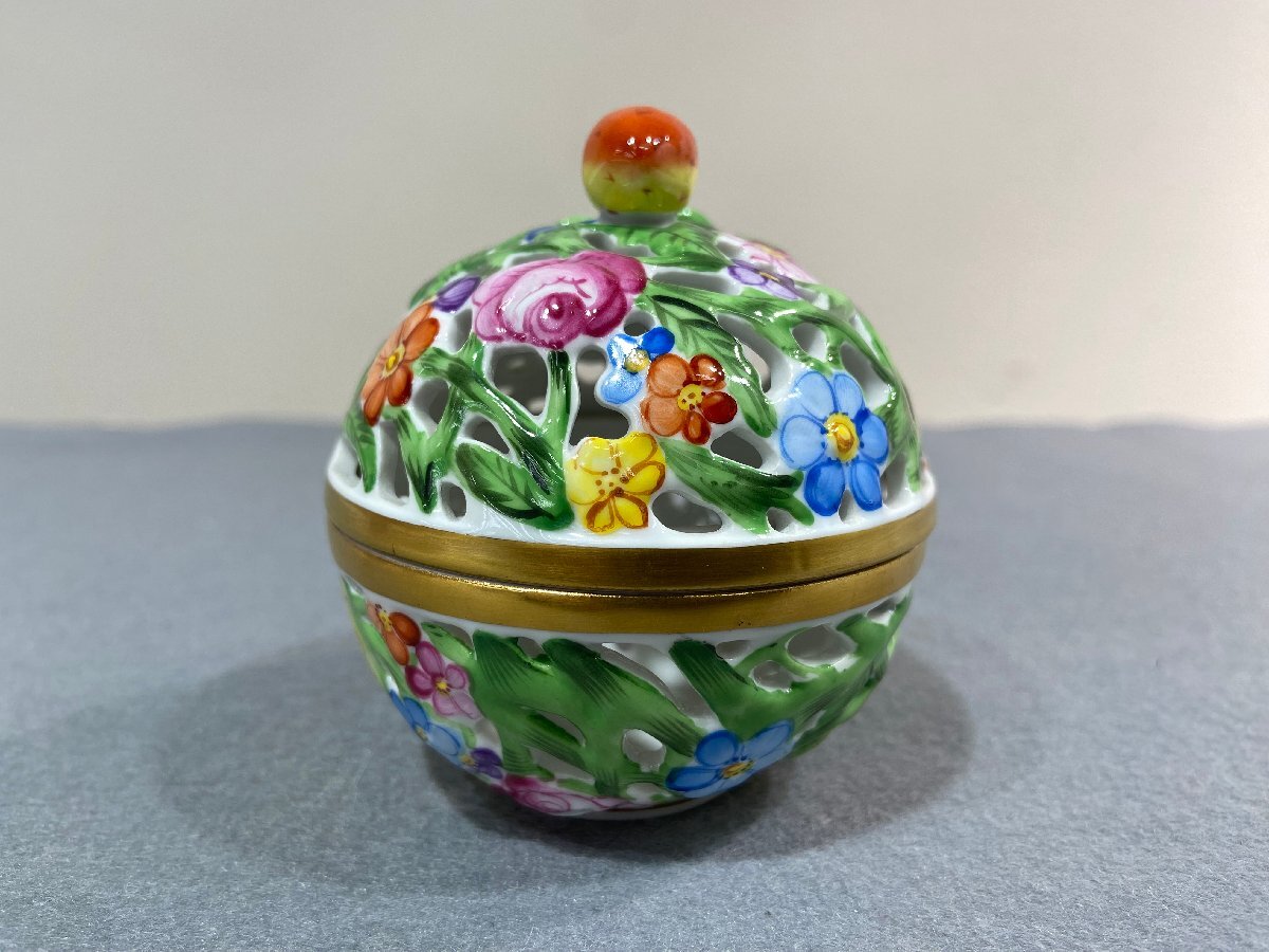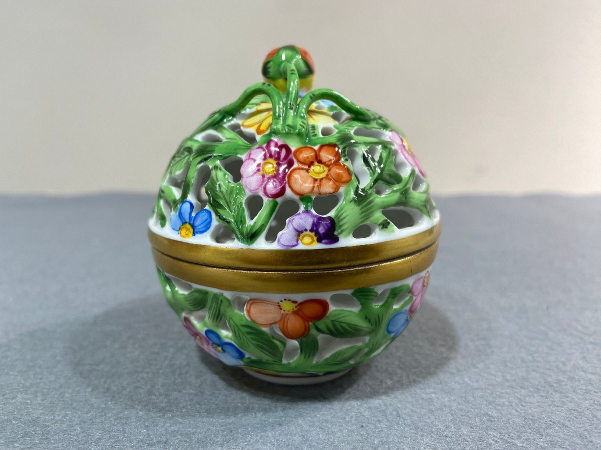 【HEREND】 ヘレンド 《ボンボニエール》 小物入れ オブジェ 白磁に色とりどりの草花×金彩 透かし模様 陶器 置物 SY02-212