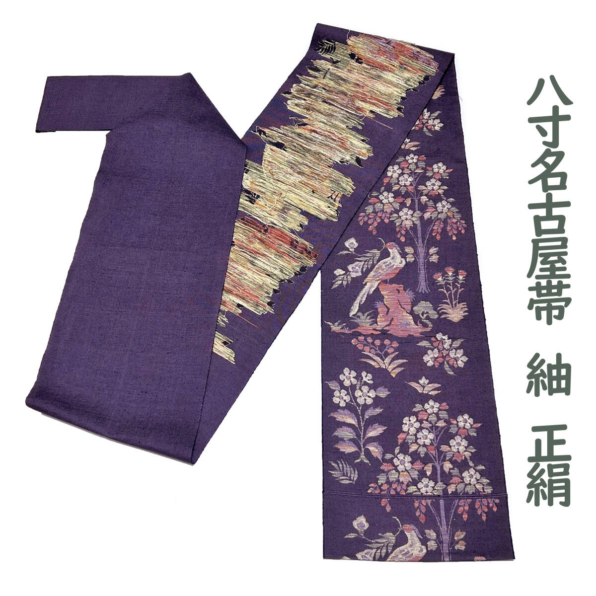 ★八寸名古屋帯 正絹 紬 うさぎ 尾長鳥 六通柄 淡い紫色 綺麗な柄 カジュアル 仕立て上がり 送料無料★