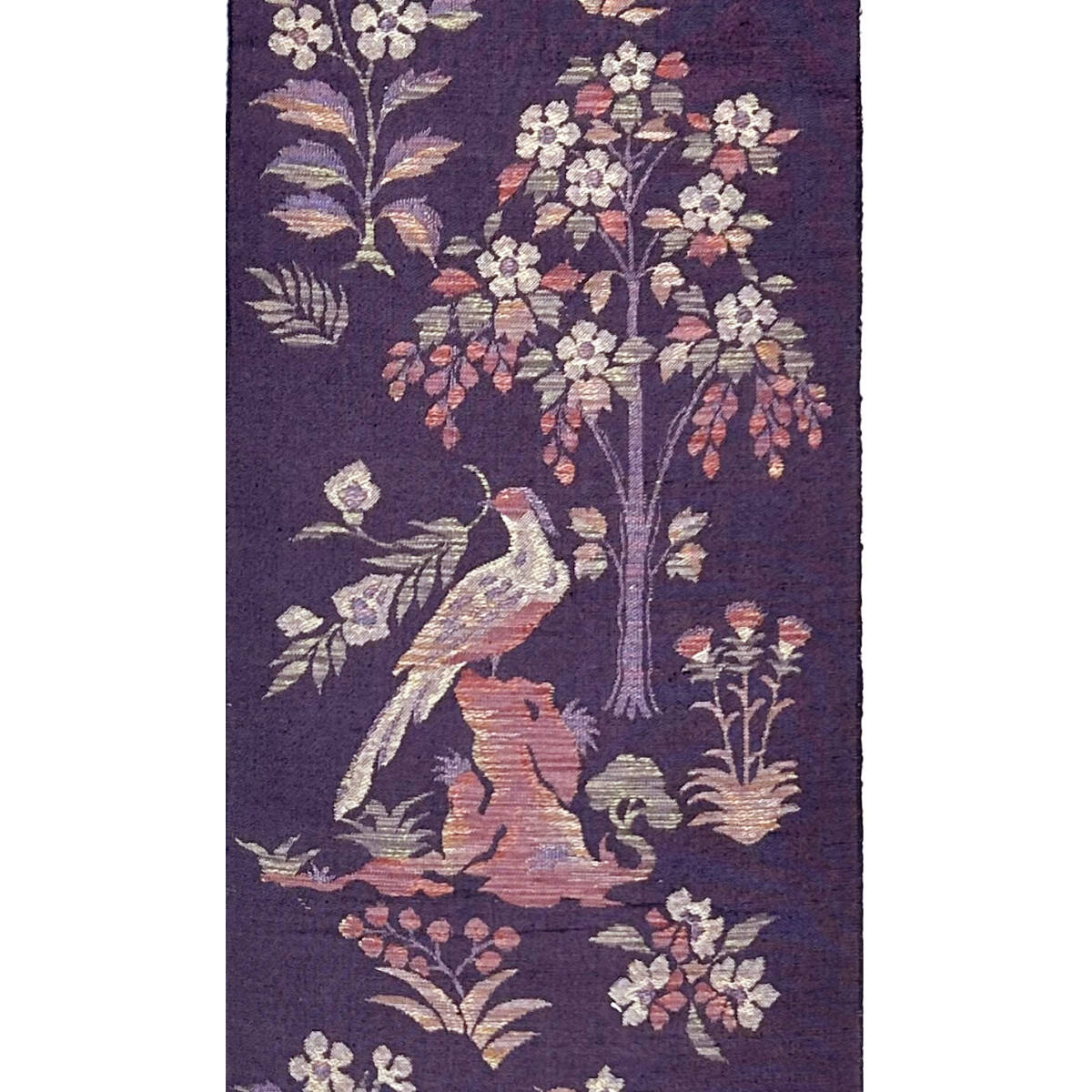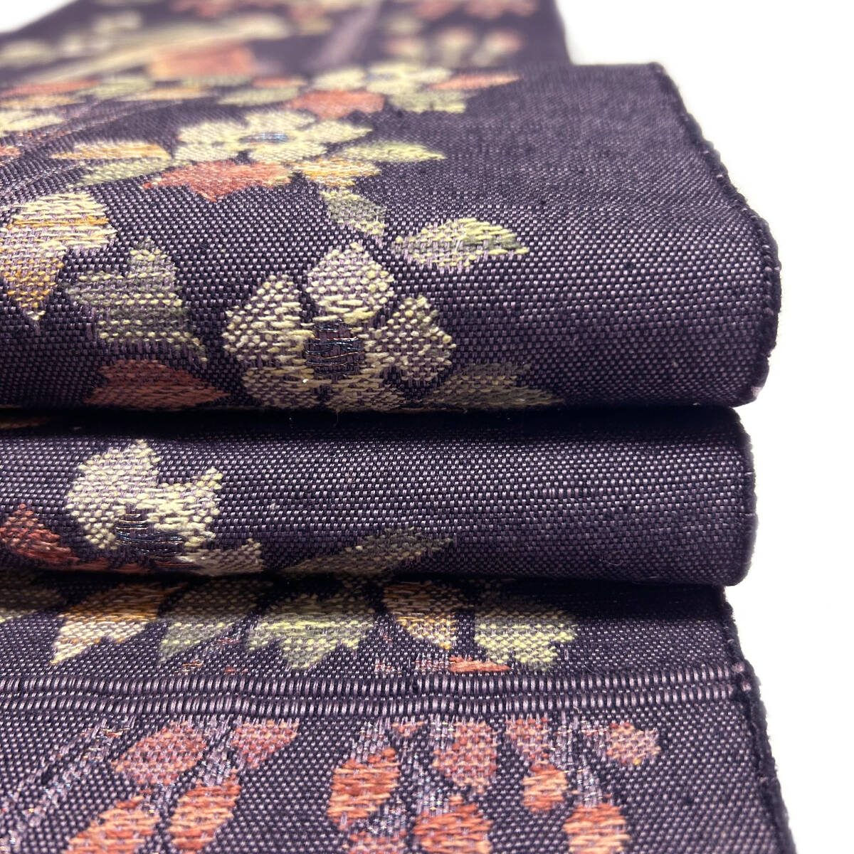 手触りの良い淡い紫色の紬地に、可愛いうさぎ・尾長鳥・唐花が織り出された、デザインがとても良い八寸名古屋帯です。