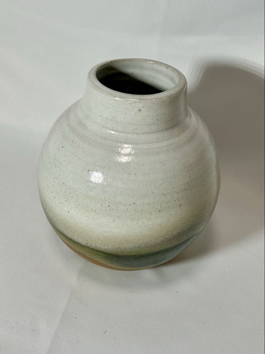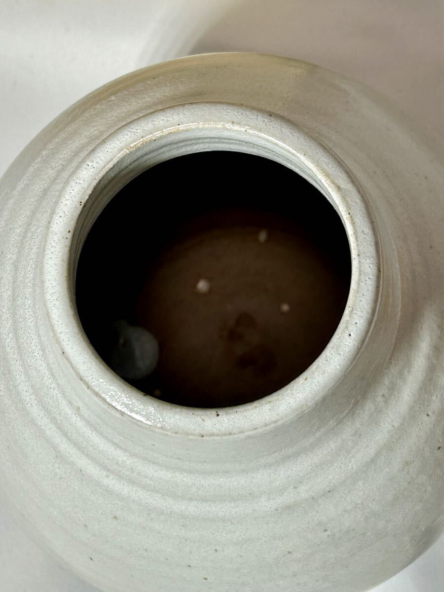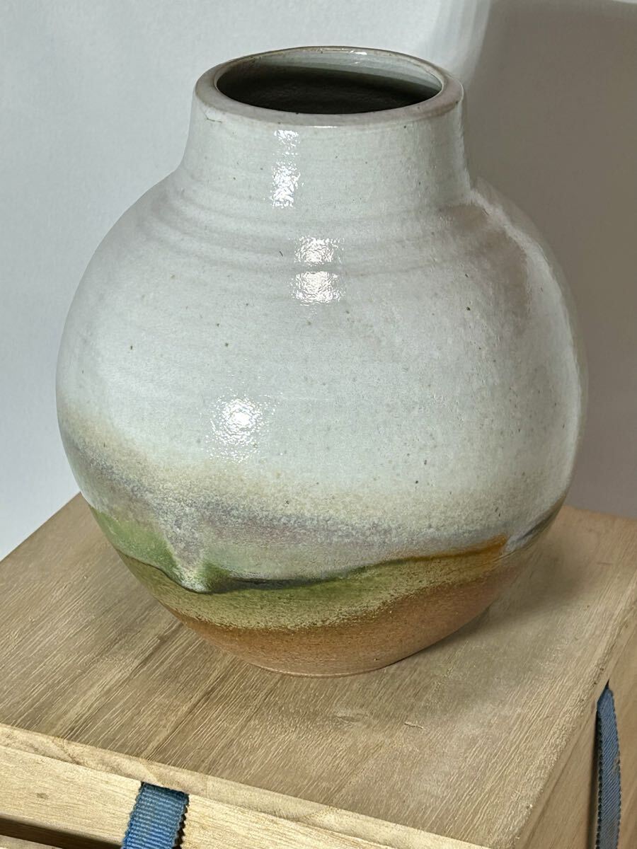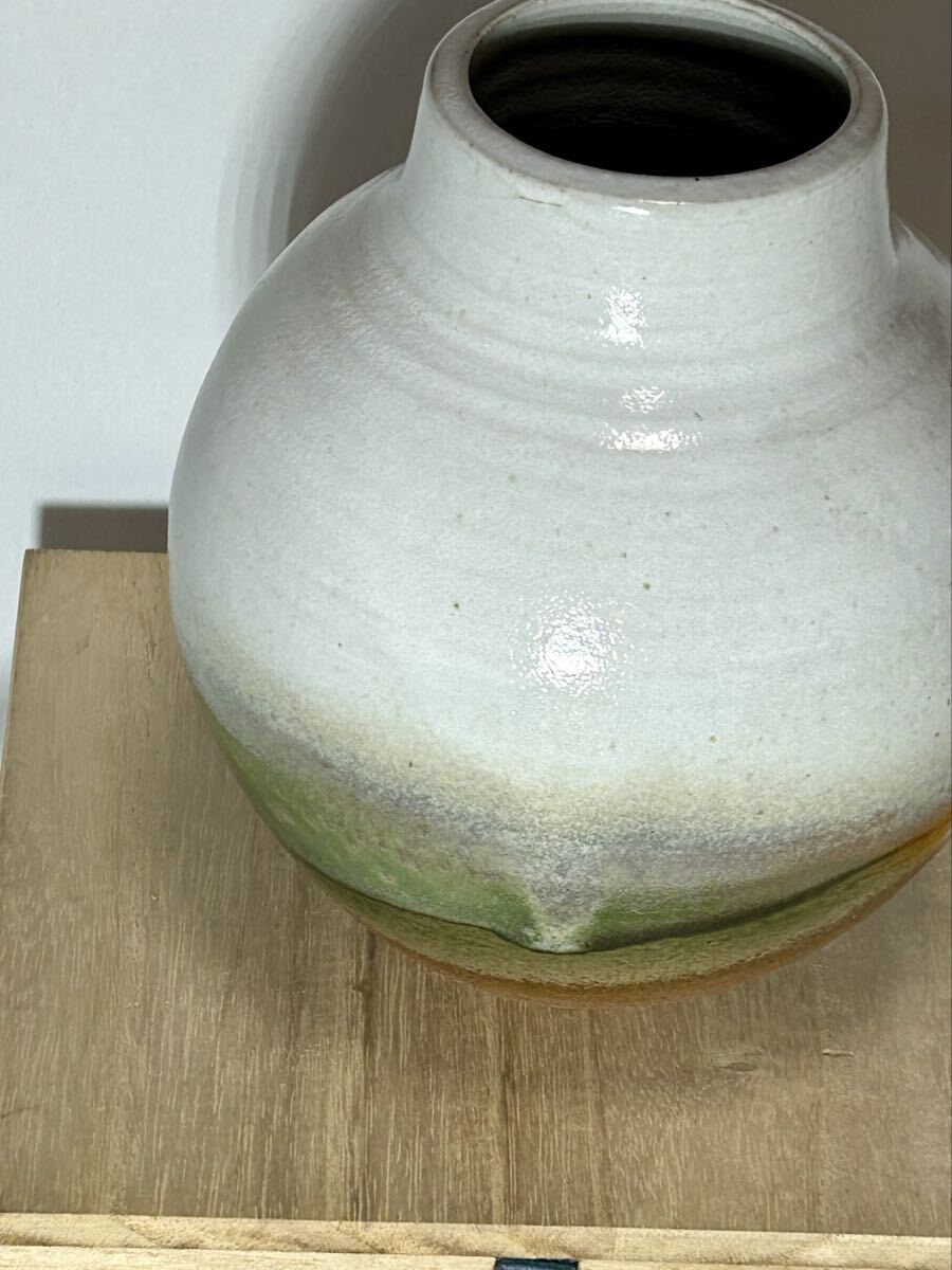白釉の柔らかな風合いに、緑〜茶の景色が自然に流れる上質な萩焼花瓶です。