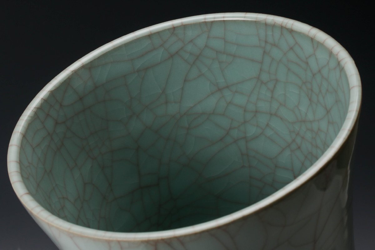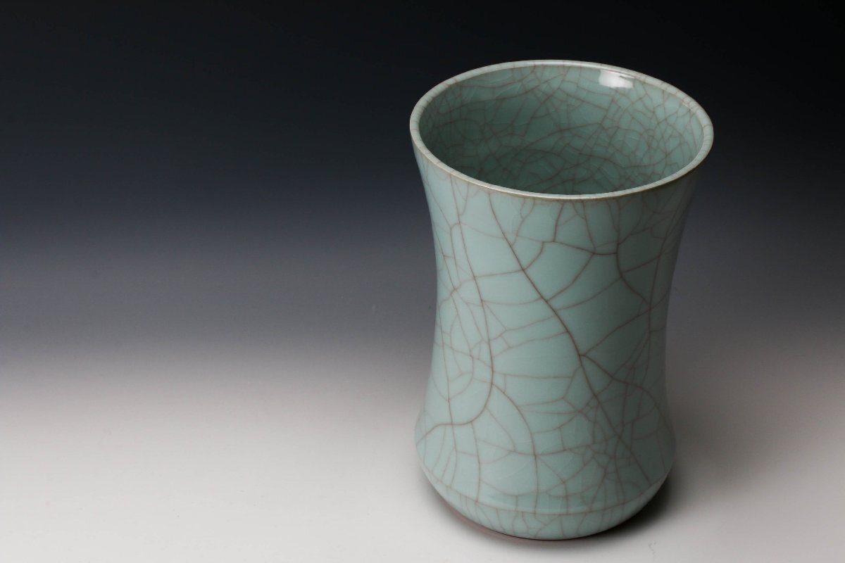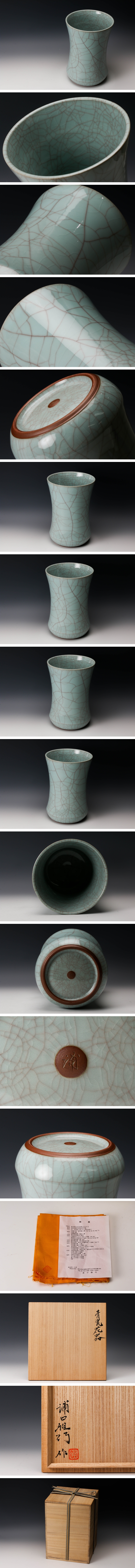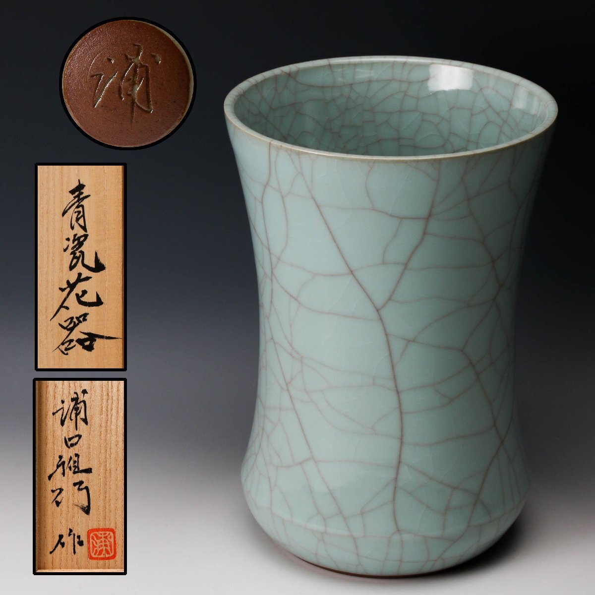 【佳香】浦口雅行 高さ25cm 青瓷花器 共箱 共布 栞 本物保証