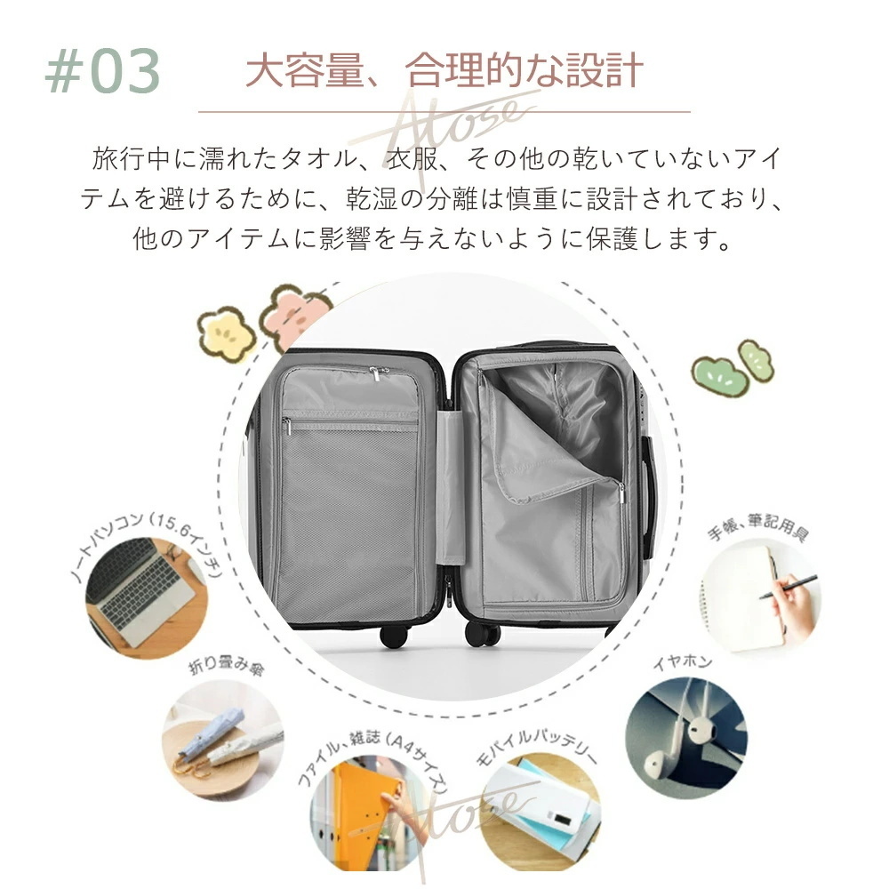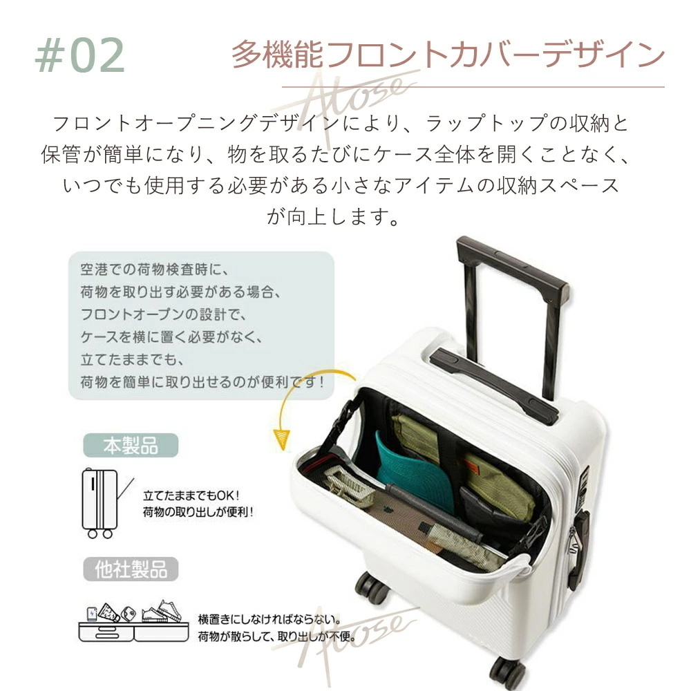 5.スーツケースにフロントポケットが付いて、スーツケースを直立させたまま開けられるので、必要な小物だけをサッと取り出すのに便利です。