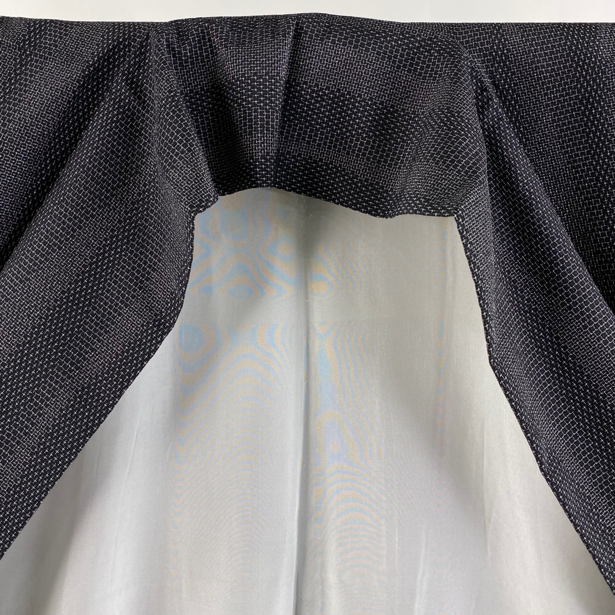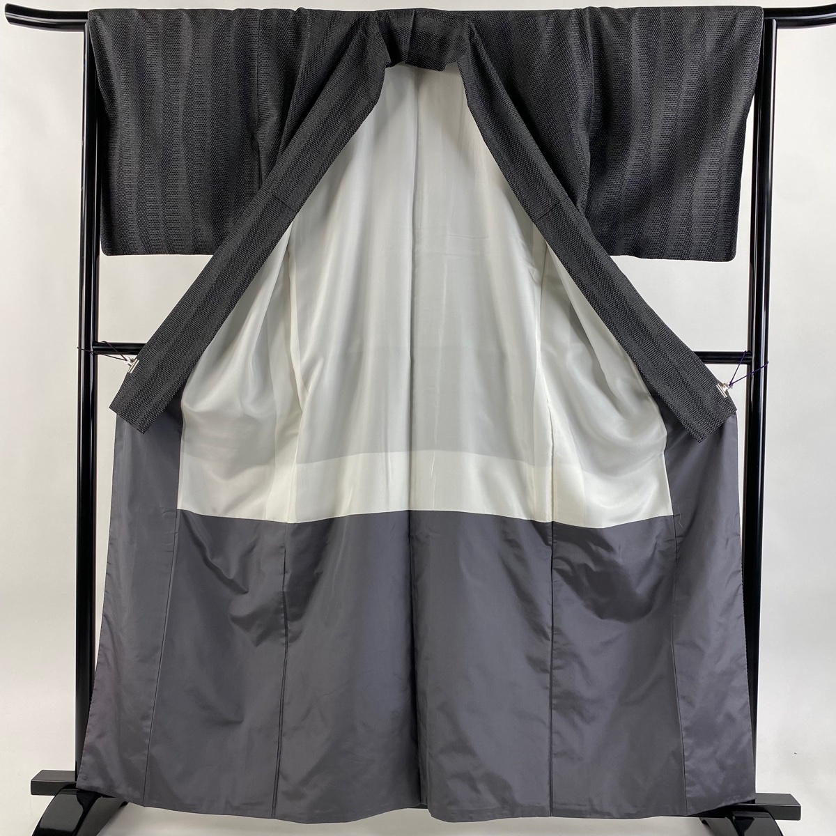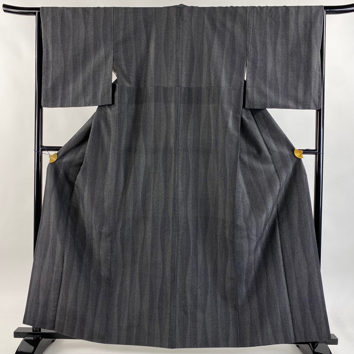 | お召 美品 逸品 証紙 雪の中のきれ やまだ織 本塩沢 よろけ縞 亀甲絣 黒灰 袷 身丈161.5 裄丈65 M 正絹 【中古】 |