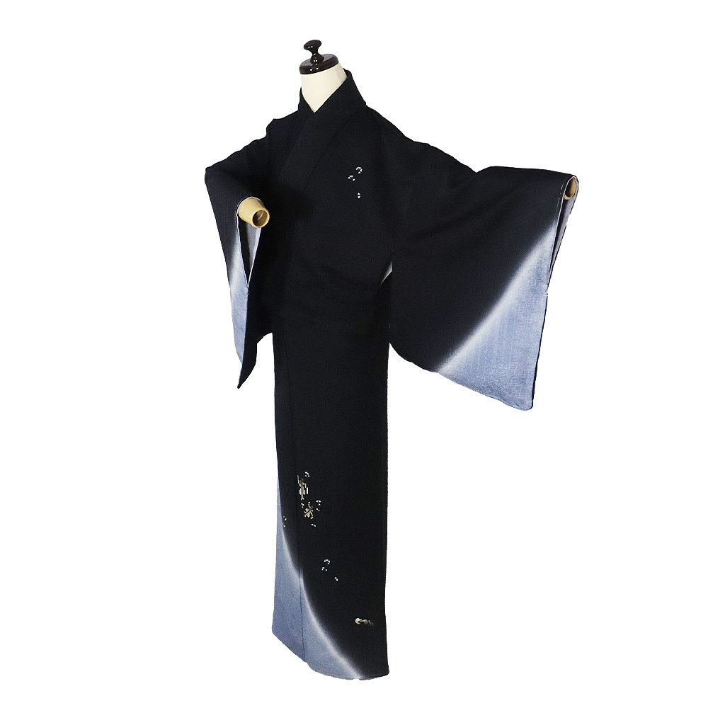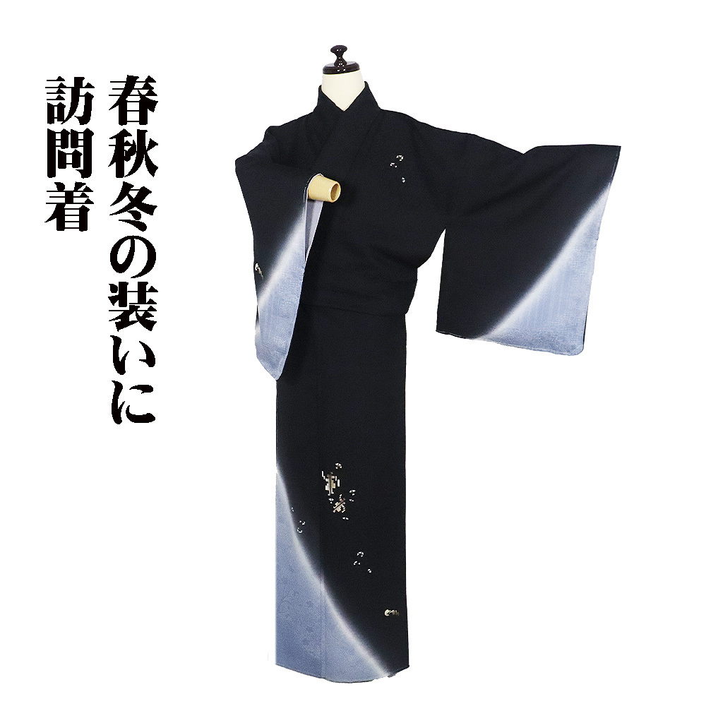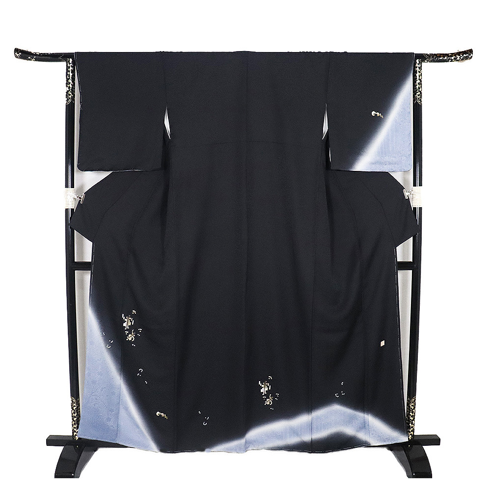 | 商品 | 訪問着 袷 丹後縮緬地 黒色(烏羽色)・青グレー(藤鼠色)・暈し地 地割れ模様地 幾何模様・梅・麻の葉 166 広襟 作家落款入り 日本製 新品 仕付け付き |