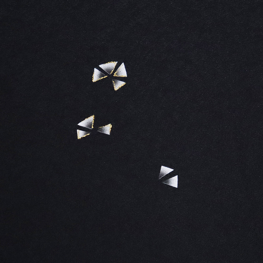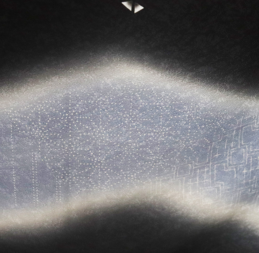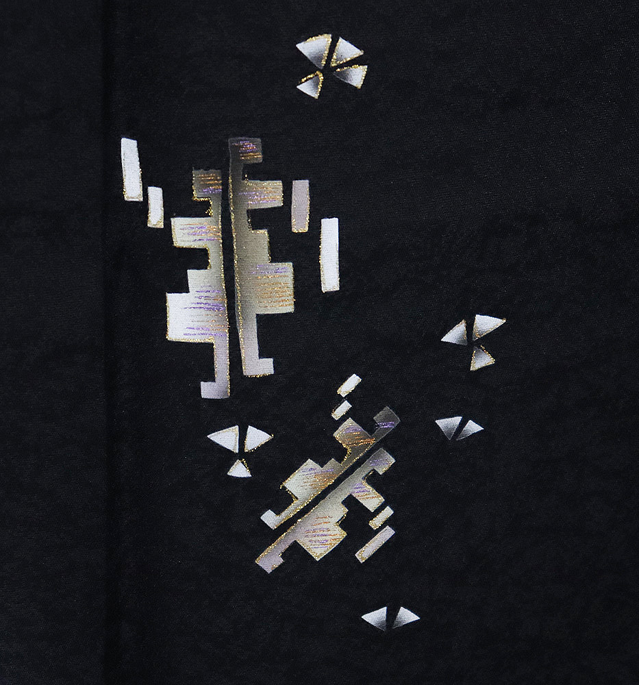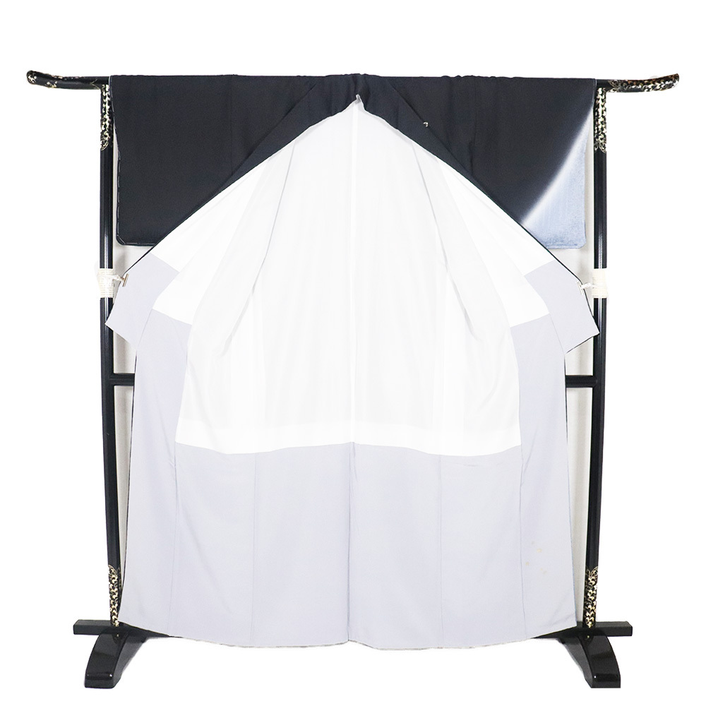 | 商品 | 訪問着 袷 丹後縮緬地 黒色(烏羽色)・青グレー(藤鼠色)・暈し地 地割れ模様地 幾何模様・梅・麻の葉 166 広襟 作家落款入り 日本製 新品 仕付け付き |