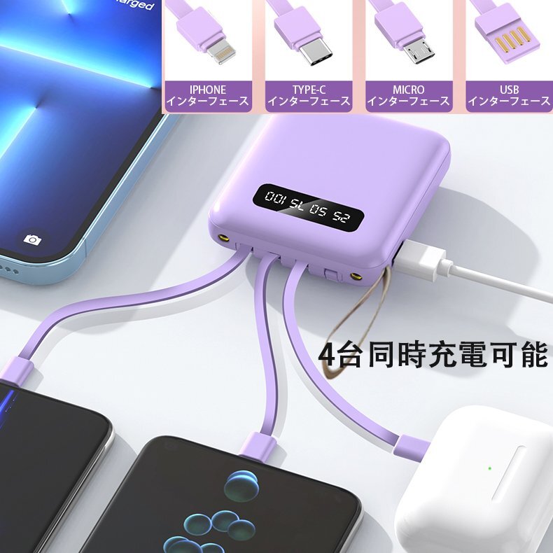 モバイルバッテリー 多機能充電ケーブル搭載 LEDライト搭載 大容量 軽量 小型 充電器 タイプc 20000mah 急速充電 PSE認証 白 ホワイト