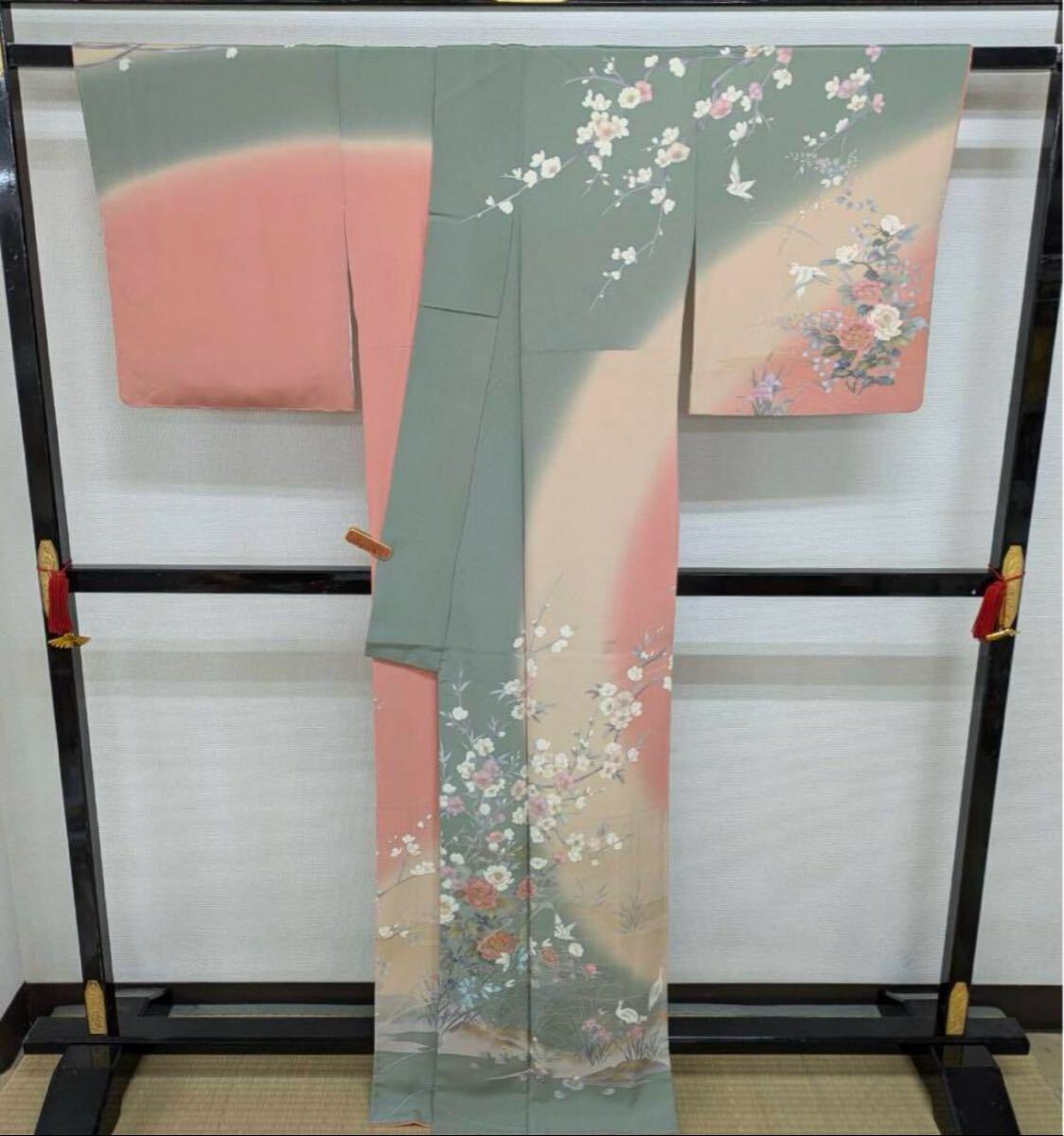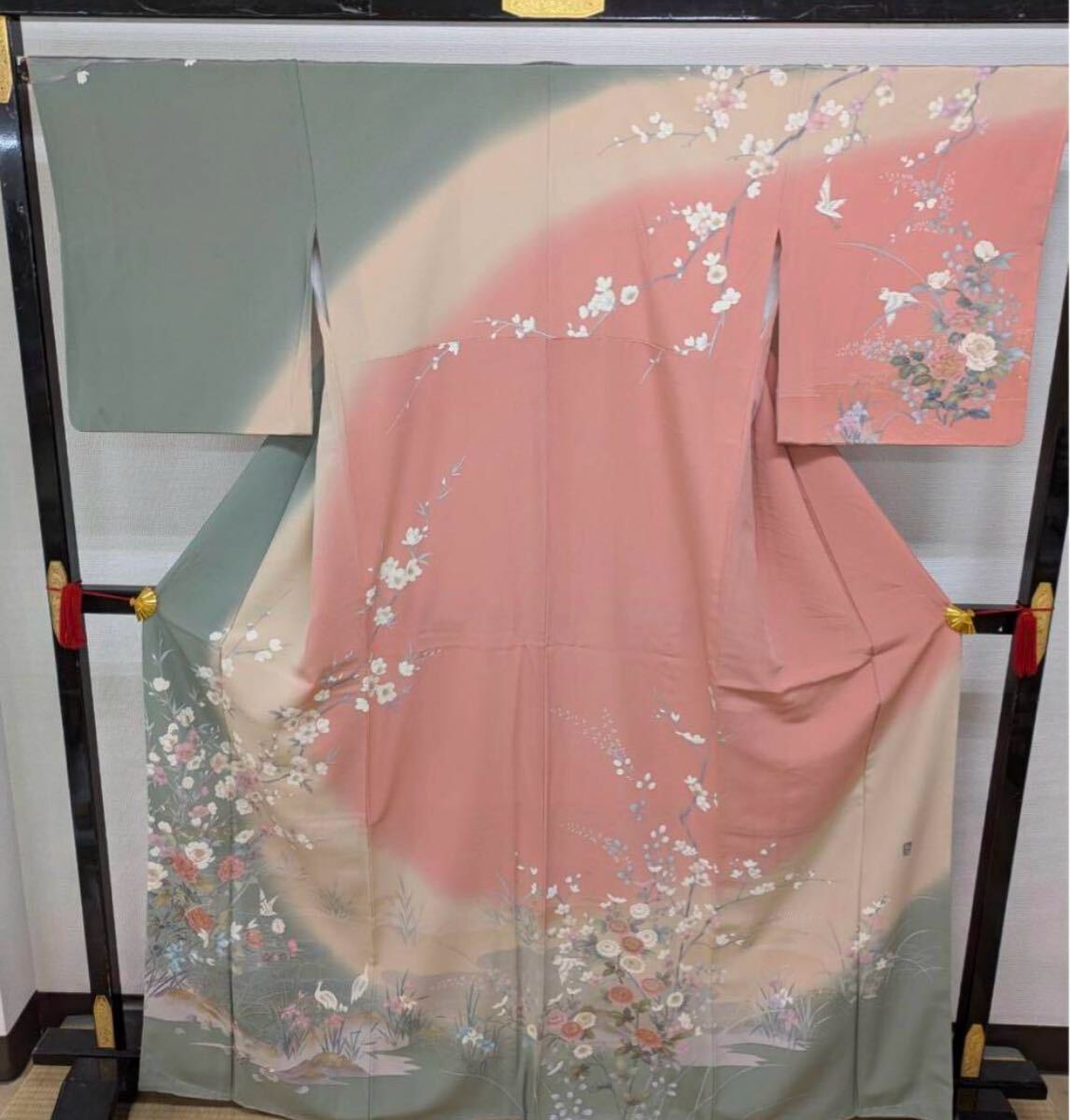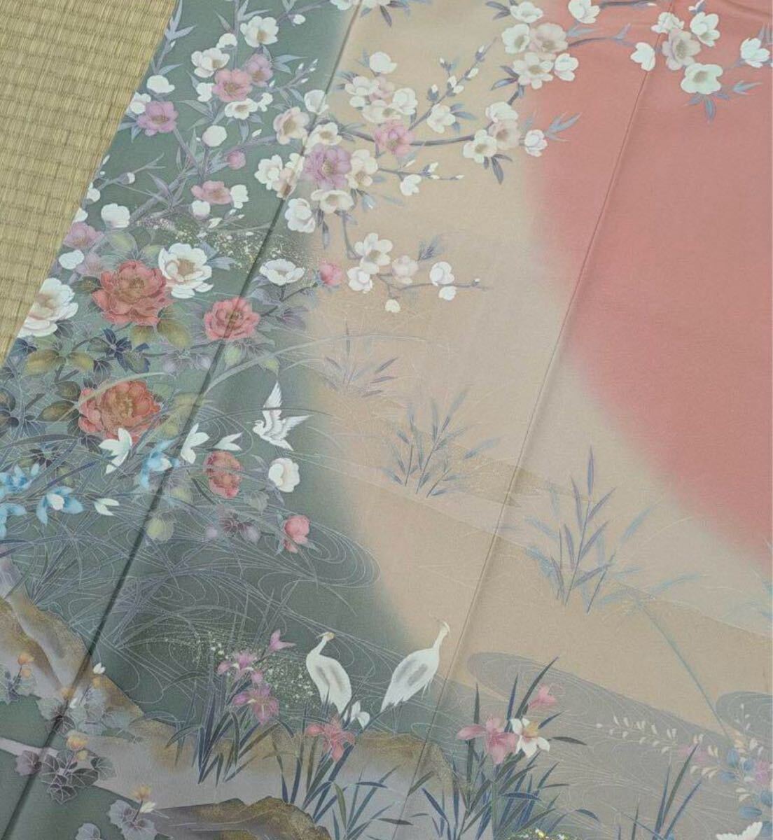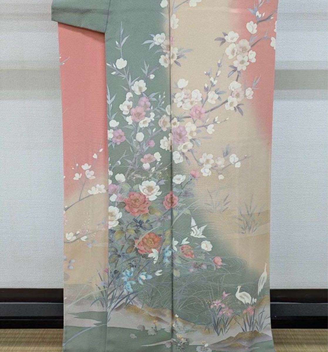 【楓】訪問着 正絹 紋無し 金彩 銀彩 ぼかし染 梅に鶴 広衿 袷 着物 KU-2119