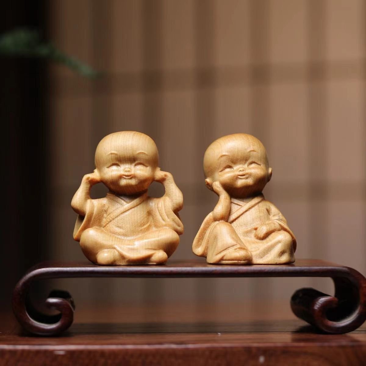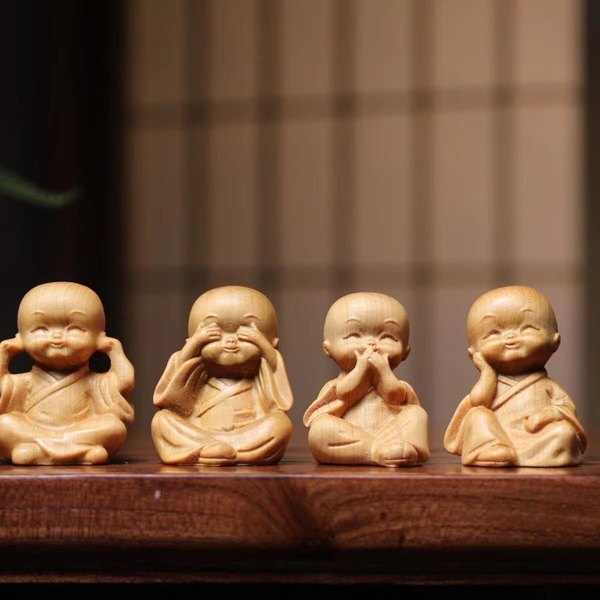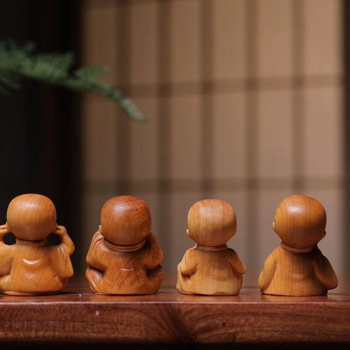 崖柏木彫り立ち小坊主4枚 禅の置物