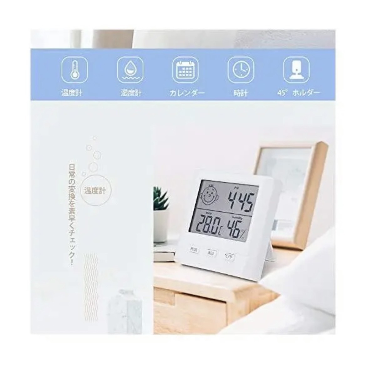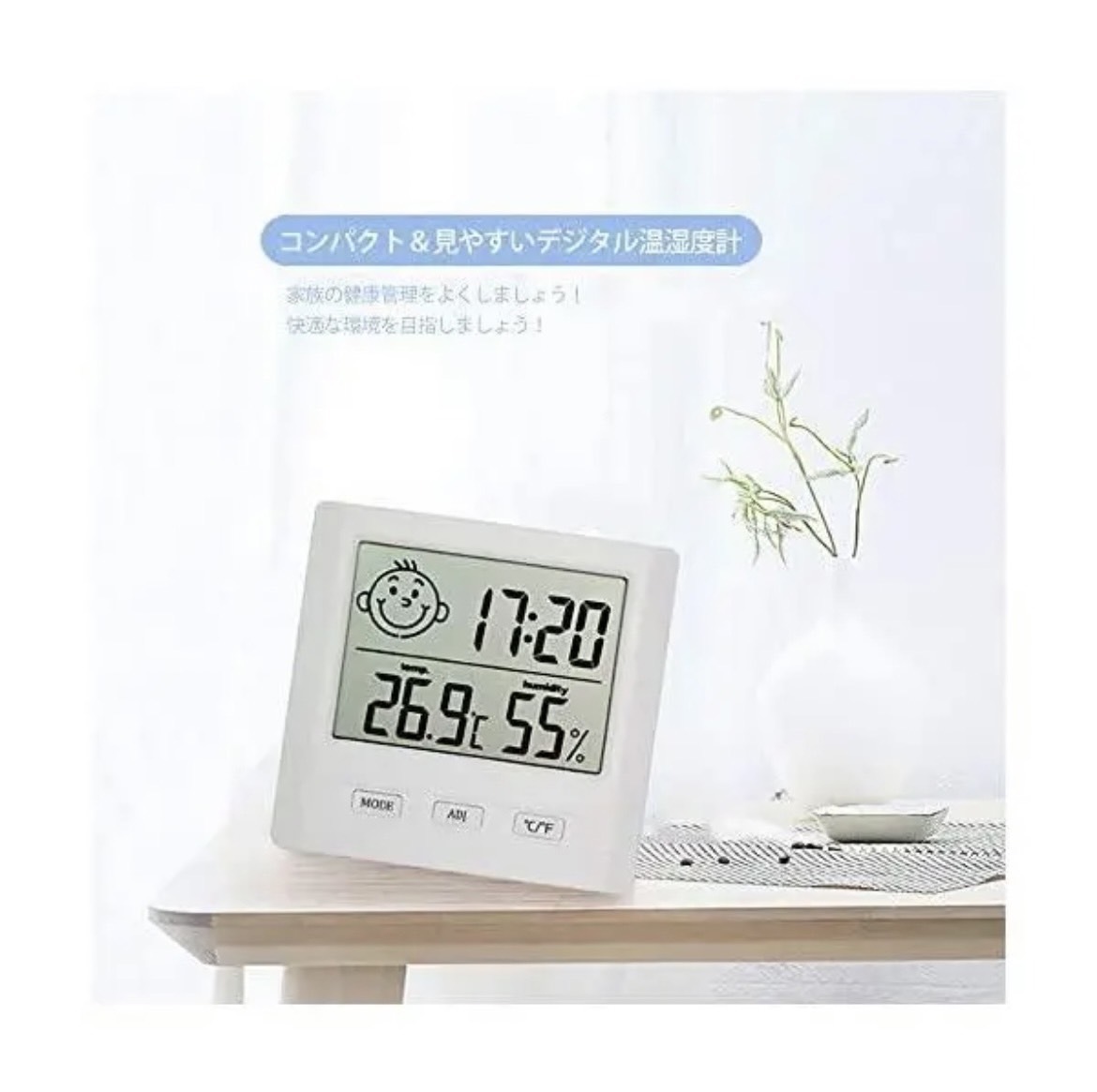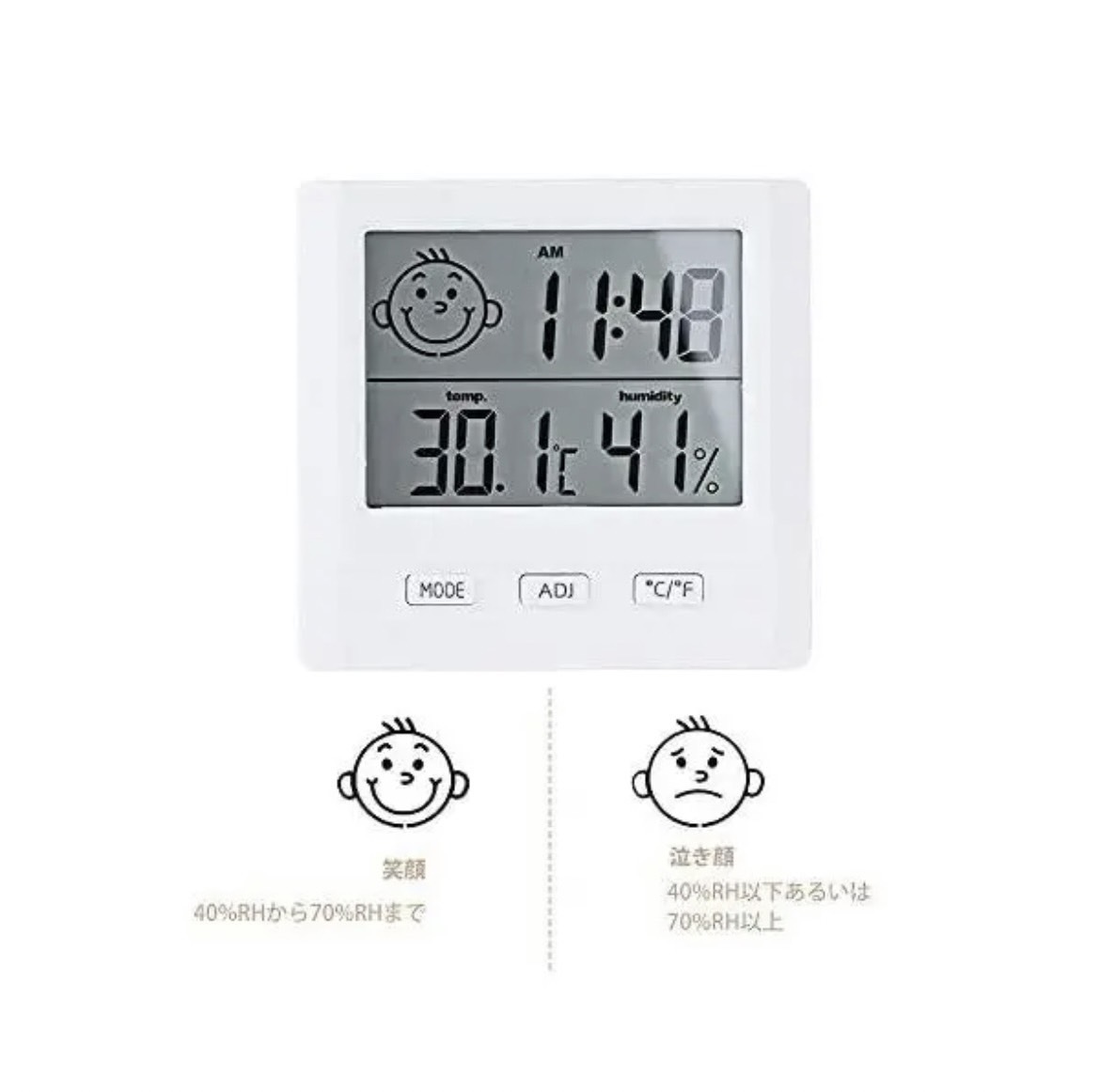 【お買い得!在庫限り!】日本語説明書付き■幅広く使用可能 湿度が高いと熱中症とカビ繁殖の原因の1つになり得ます。空気が乾燥していると、インフルエンザや風邪を発症する原因の1つになり得ます。赤ちゃんは乾燥や湿気に敏感で、お母さんも管理にくいです。温湿度計が手に入ったら、簡単に生活環境の温度や湿度を確認し、除湿または加湿などの対策を行いましょう!当温湿度計は熱中症カビ対策・インフルエンザ風邪対策・赤ちゃんの健康管理に・お肌への潤い環境チェックなどに役立っています。■多機能デジタル温湿度計 当温湿度計は温度計・湿度計・時計の3機能を集めたアイテムです。顔文字で楽に家の温湿度を確認できます。■置き掛け便利な2way 卓上スタンドと壁掛け用のフック穴が付き卓上にも壁掛けにも対応できます。どちらでもOK!配線工事不要で女性でも手軽に設置できます。直接日光が当たる場所や冷暖房器具、加湿器などのそばは避けて設置するのをおすすめします。■温湿度同時に測定可能 ・温度測定範囲:-9.9〜70℃・温度精度:±1℃・湿度測定範囲:10〜99.9%(RH)・湿度精度:±5%(RH)・温度解像度:0.1°C(0.2°F)・湿度解像度:1%■仕様 ・カラー:ホワイト(白)・サイズ:82mm×78mm・表示内容:時計・日付・温度・湿度。湿度と温度を同時に測定可能※単4電池×1(乾電池は付属しません)■注意事項 ・海外製品のため、多少の傷や汚れ等ある場合がございます。・送料の都合上簡易包装での発送となります。コメントなしでの即購入OKです。おまとめ買いでお値引きさせていただきます。お気軽にコメントください。