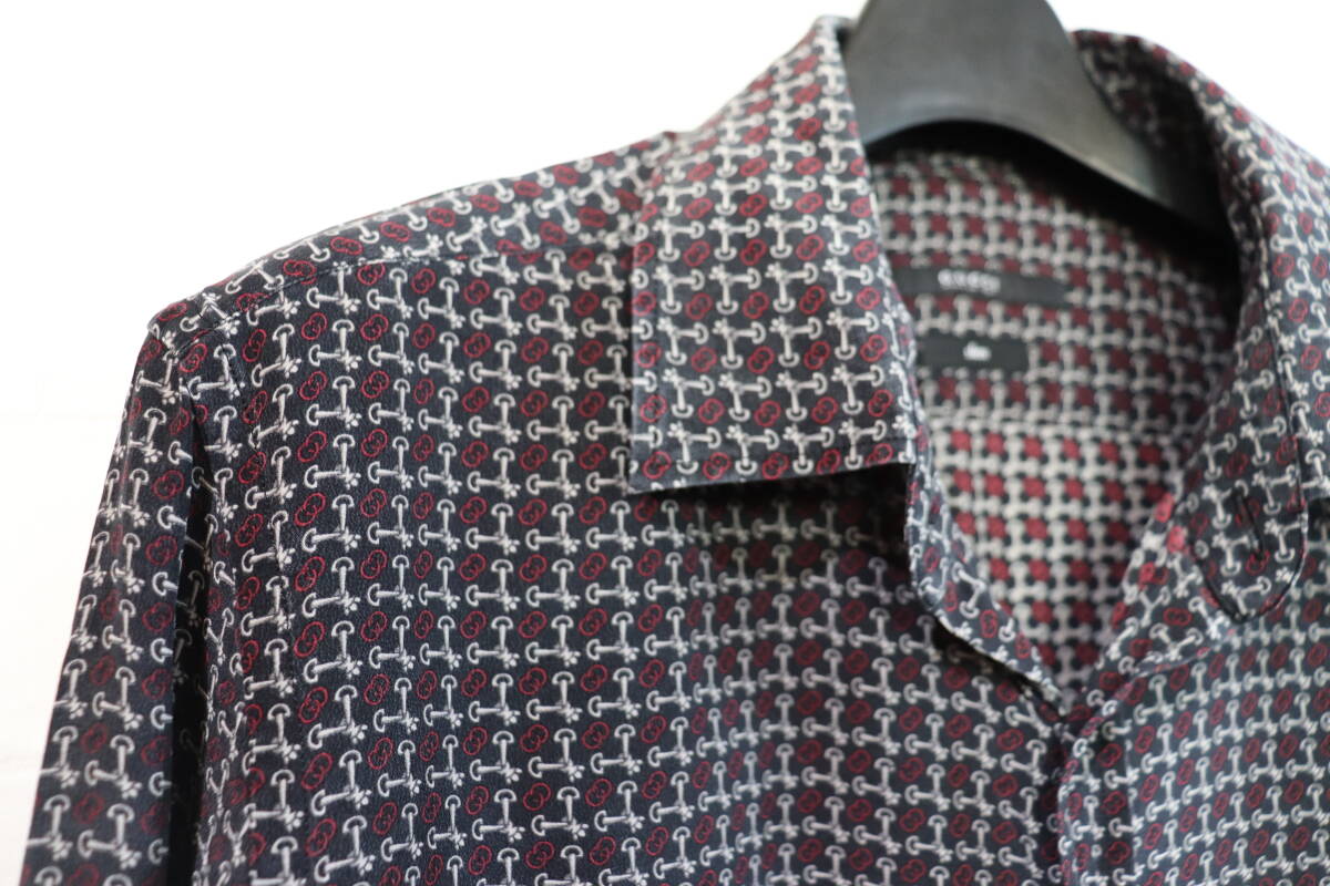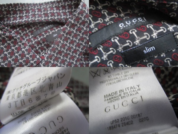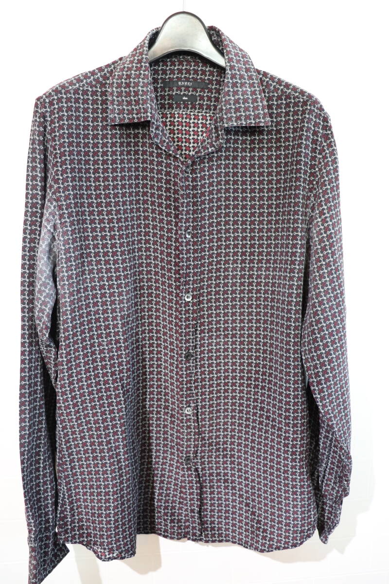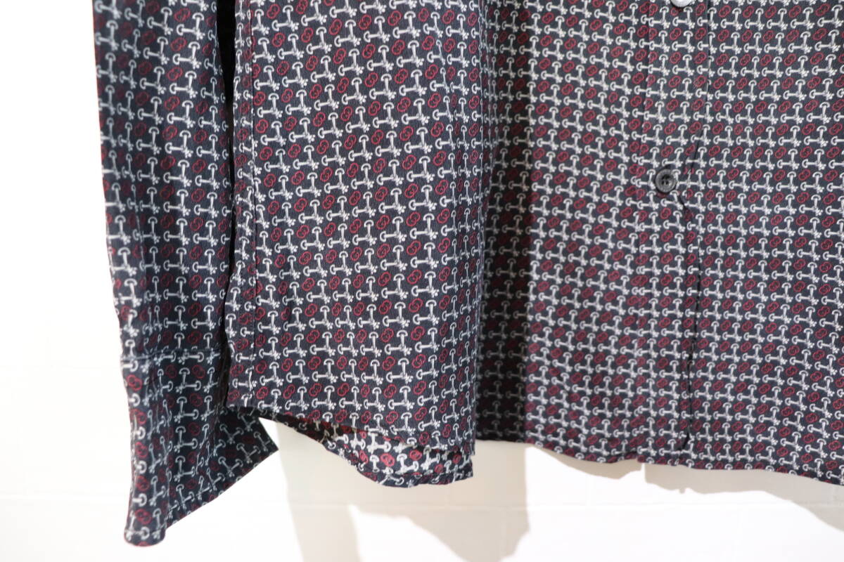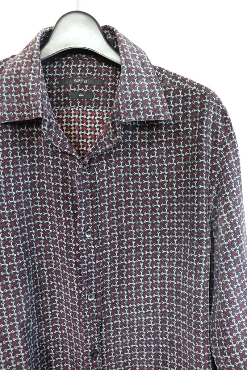 即決 GUCCI グッチ GGマーク&ホースビット総柄 長袖ドレスシャツ シルクシャツ メンズ 42 16 1/2 イタリア製 ブラック レッド シルバー