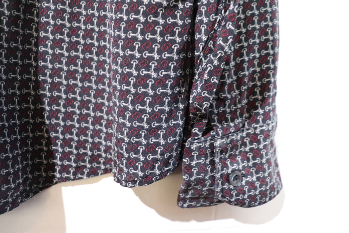 『名作    国内正規品    イタリア製    GUCCI    ホースビット総柄長袖シルクシャツ    メンズ42    ブラック&レッド&シルバーカラー系』