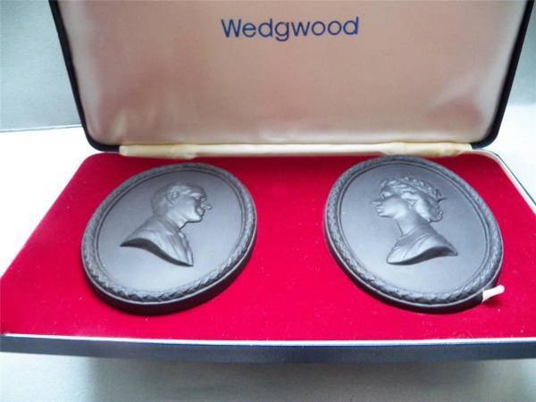 ◎限定品 ウェッジウッド 純黒ジャスパーメダル 陶板2枚セット 壁掛け 「英女王銀婚記念」◎箱付