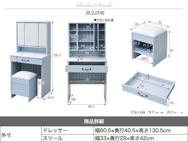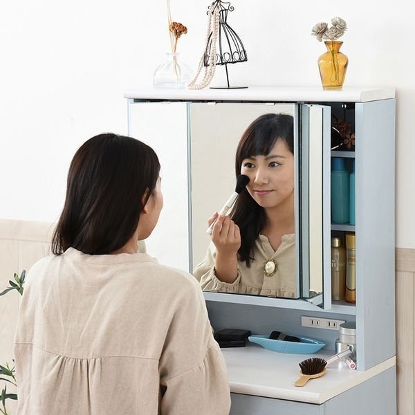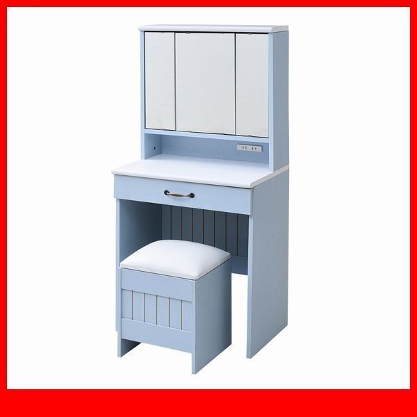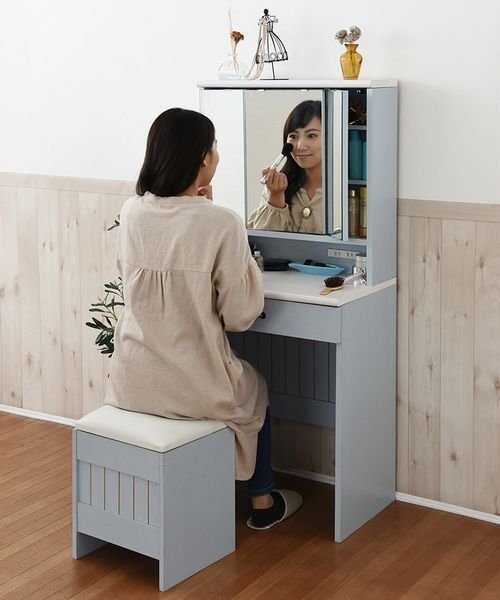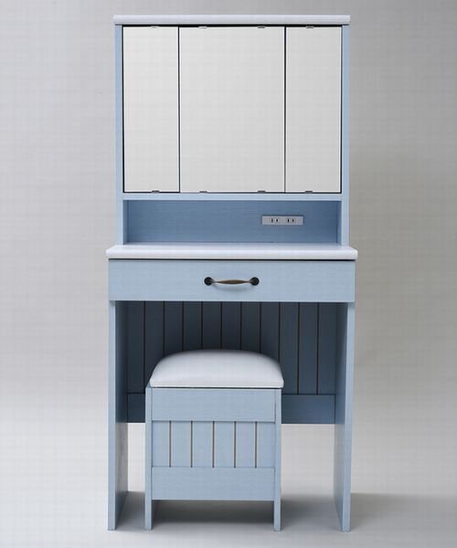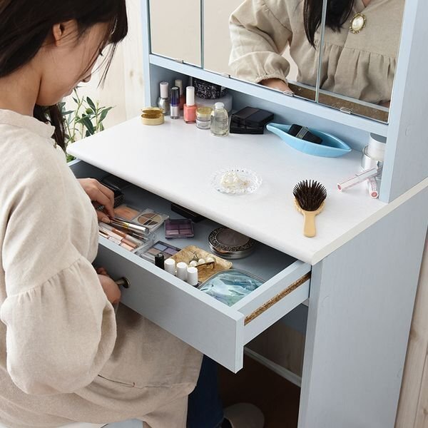 | バイカラーで魅せるフレンチカントリースタイルの三面鏡ドレッサー&スツール。 コンパクトサイズなので一人暮らしにも最適です。 三面鏡扉の裏は、たっぷり収納できる空間。 可動棚で自由に調整できます。 広々とした天板で、毎日のメイクも快適に。 広めの引出は小物のコスメの収納に最適。 セットのスツールは座面下にも収納スペースがあります。 丸みを帯びたフォルムと、アンティーク調の取っ手といったディテールがカントリーテイストを漂わせます。 |