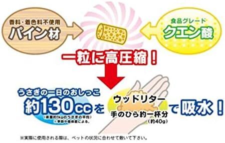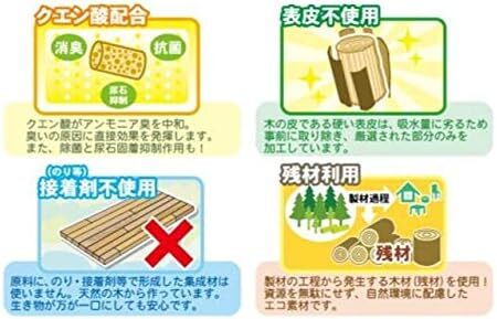 ●天然木材(パイン材)にクエン酸を配合し、高圧縮成型したペレット状のトイレ砂です。