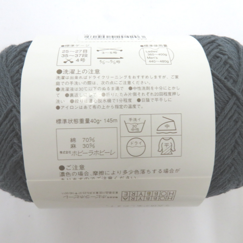 | 商品説明 | ホビーラホビーレのコットンリリー8玉セットです。 色はやや青みのあるグレー系。ナチュラルな色合いの糸です。 綿70% 麻30% 1玉約40g/糸長約145m | ||
