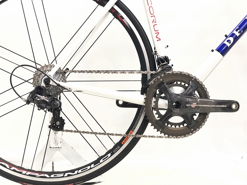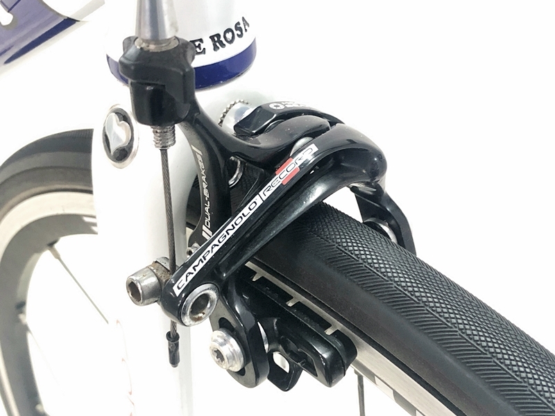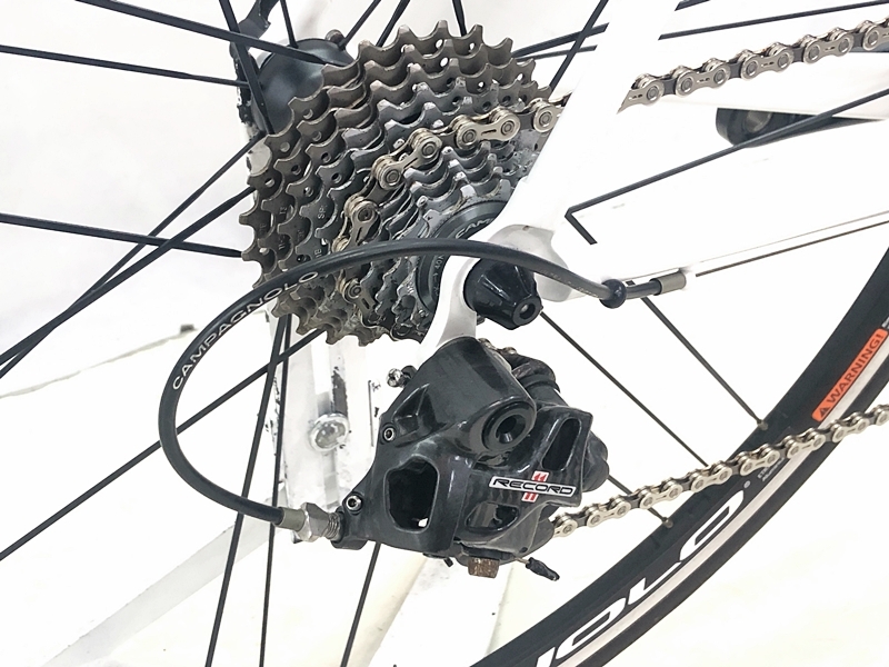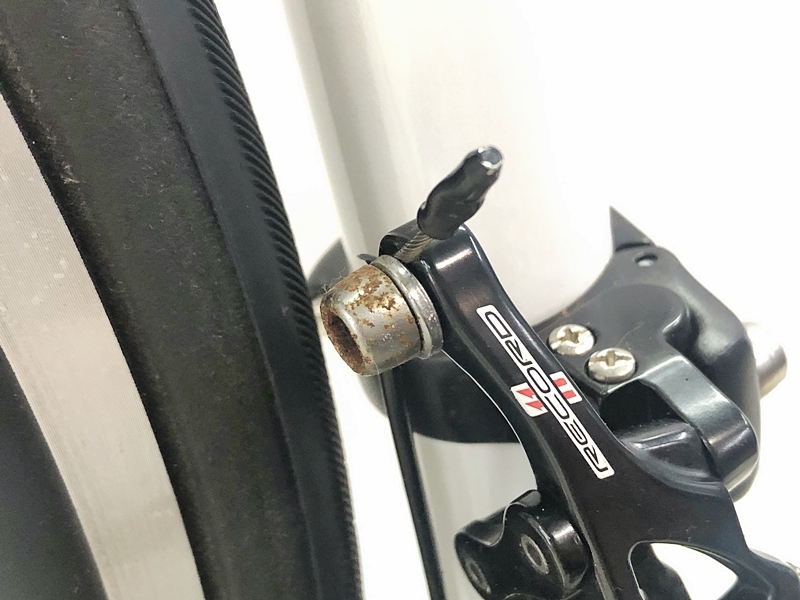 フレーム、その他外観:STIレバー、サドル、クイックレバーにキズがあります。フレームの一部、パーツ類に小キズがあります。リアディレイラーネジ、フロントディレイラーネジ、ブレーキネジ、シートクランプのネジにサビがあります。ホイールのシューの面に白サビがあります。ダウンケージに色剥げがあります。チェーンの交換はしてありますが、RECORDではありません。シートポストが短いです。