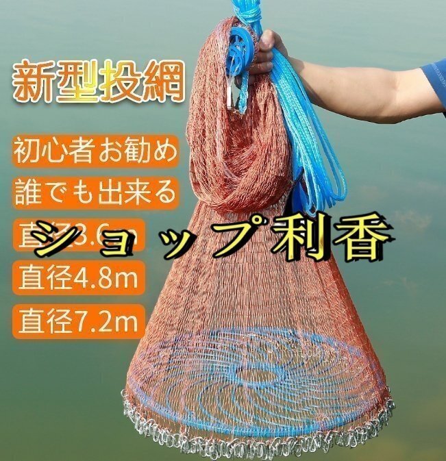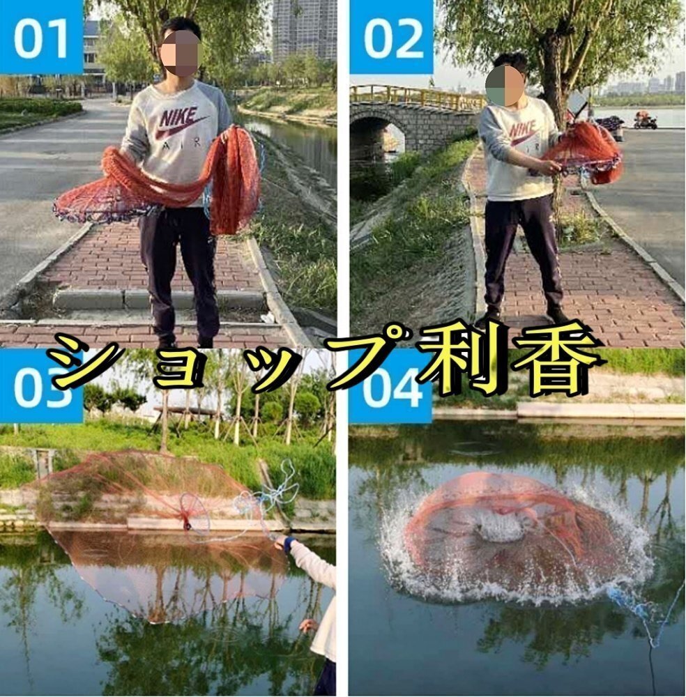*商品説明* *1マスの網目のサイズ(細やかさ):約1.5cm *ロープの長さ 約10m 網の直径:①約3.6m ②約4.8m ③約7.2m 三種類がございます。 網の外周:①約11m ②約15m ③約22m 重量: ①約2.2kg ②約3kg ③約3.5kg 丈: ①約1.8m ②約2.4m ③約3.6m *素材:ナイロン(普通の網より丈夫) 鉛 *初心者でも,職人でも,お勧めの一品です。手取りは普通の投げ網と同じです。投げる動作は普通の投網と比べて腕が何十倍以上楽です。写真に各段取りの使い方法が掲載しています。 *写真を見て操作方法やはりゲットできない方はYouTubeで投網を探してください。使い方の動画がだくさんあります。 *ステップ2投げる時:円盤を回すことが本商品が使うコツです。回せば回すほど,網が開きます。 *初心者でも大量の魚をゲットできます。 *収納袋はございませんので,ビニール袋入れてちゃんと梱包して発送します。 *使用後はしっかり水で洗いゴミを取り除き日陰で干してください。 *直射日光は網の劣化を早める原因となるため、網が乾いたら直射日光を避け保管ください。