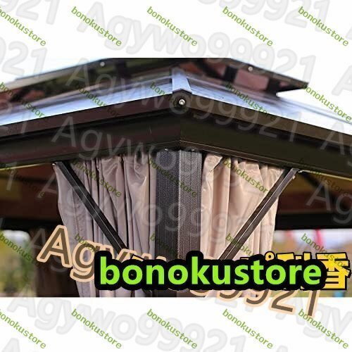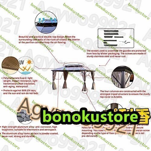 商品説明 商品説明 2層ベンチレーテッドルーフ:2層ポリエステルルーフ、PUコーティング、耐水性、耐紫外線性、ベンチレーテッドルーフを介して、小雨や晴れた日からの全面的な保護を提供し、熱と風を減らします。 アルミフレーム:頑丈な粉体塗装の錆びにくいアルミガゼボフ