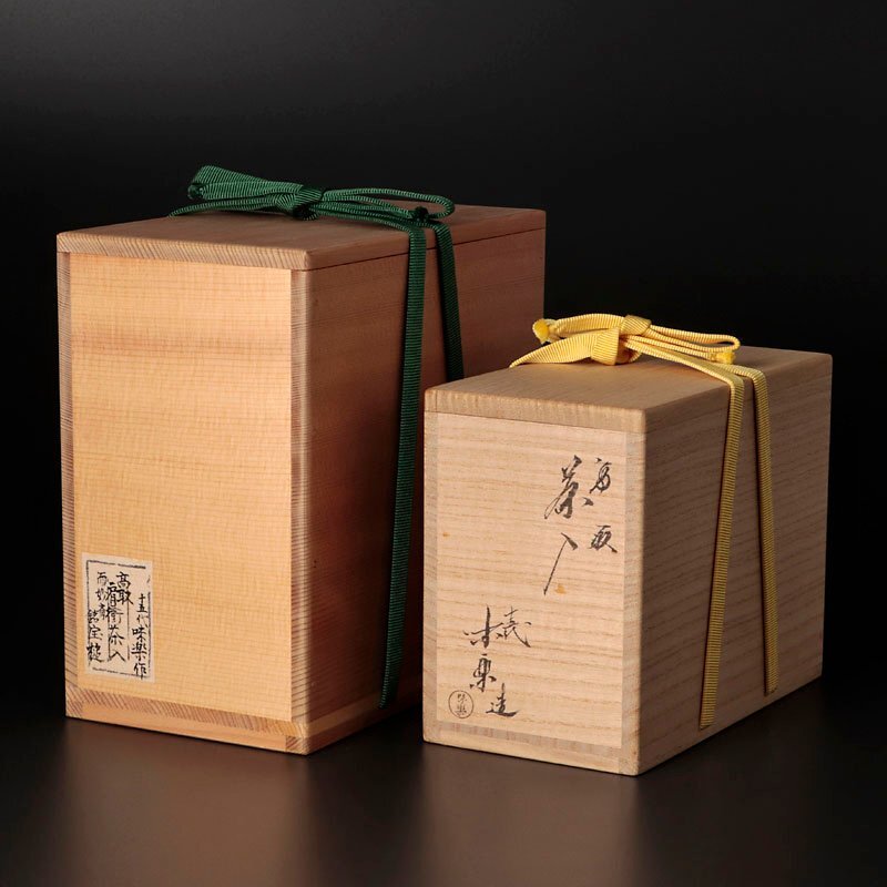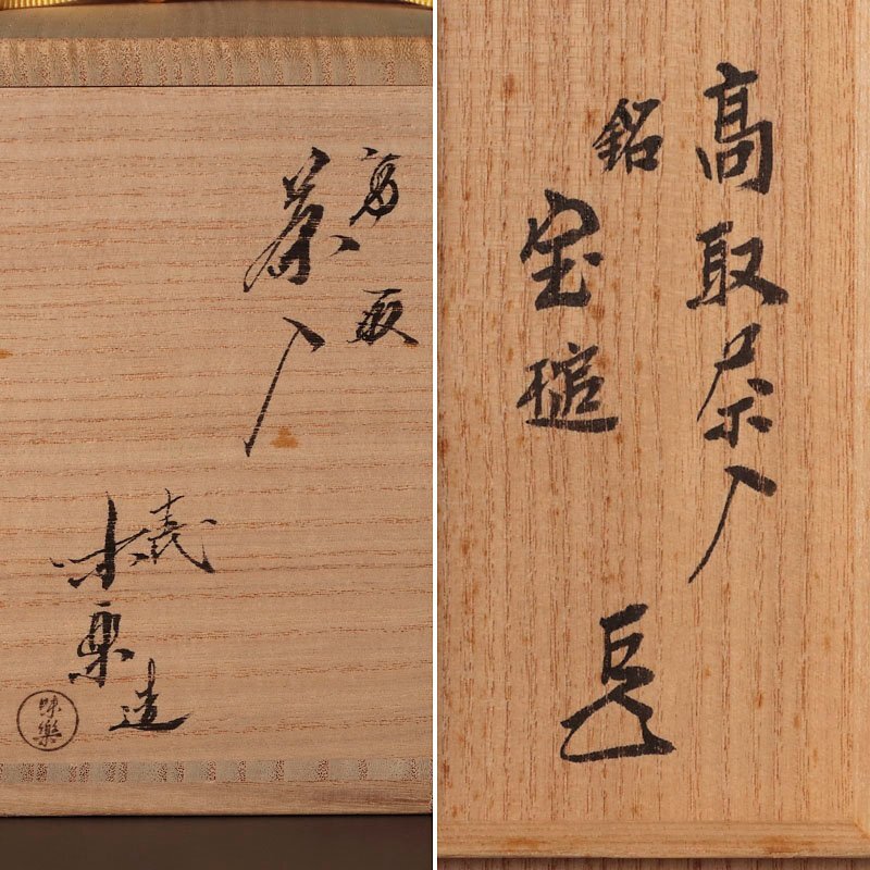 【十三代亀井味楽】 明治16年生まれ。高取焼11代の高取久助寿泉の長男として生まれるが、その頃高取窯は藩の庇護を失い民窯としての自立を迫られて窯元の大半が廃業となる厳しい時代であったが、20歳の頃に福岡の東皿山窯を引き継いで窯名も太宰府天満宮裏山の山伏修行場「宝万山亀山坊」に因んで亀山味楽窯と改称。以来、伝統の高取焼の研鑽を深め茶陶を中心に制作を続ける。1944年には商工商より技術保存者の認定を受けるまでの復興を成し遂げた人物。 【而妙斎】 昭和13年(1938)生まれ。表千家14代家元。13代即中斎の長男で、昭和42年に大徳寺の方谷浩明老師より「而妙斎」の号を与えられて宗員となる。昭和54年に即中斎が逝去し、翌55年2月28日に14代宗左を襲名した。平成2年(1990)には利休400年忌を迎え、法要をいとなみ茶事を催している。平成30年2月28日、代を譲り、隠居名の宗旦を名乗る。 |