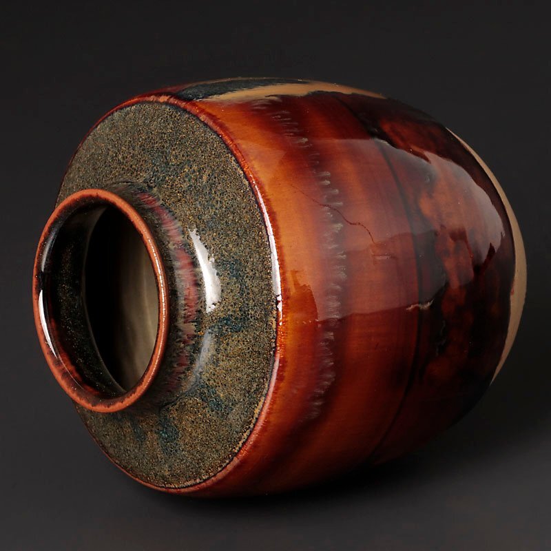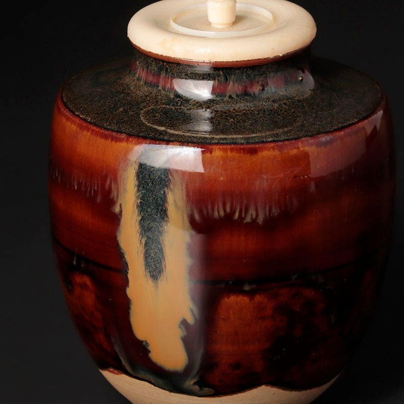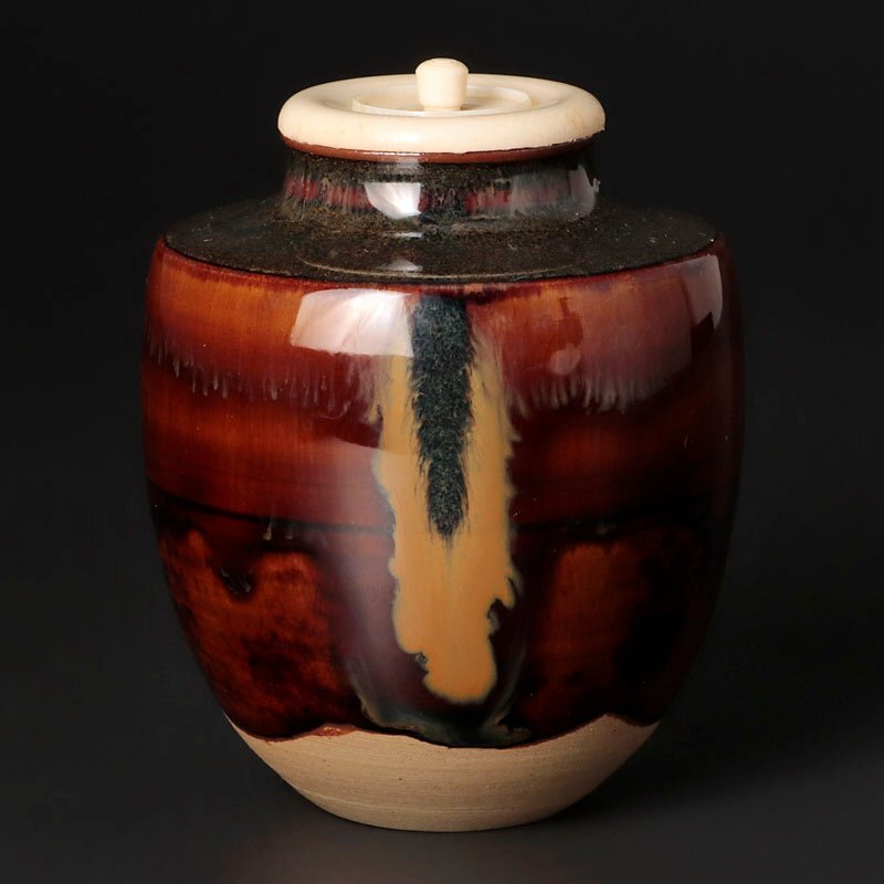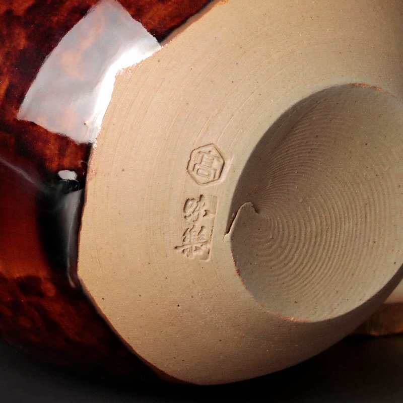 飴色の美しい肌合いとゆったりと流れる釉の落ち着いた景色が魅力的な逸品です。 仕覆2枚(画像左:利休梅緞子、右:有栖川鹿文緞子)付属いたします。 ★商品は十三代亀井味楽造、而妙斎書付の作品である事を保証致します。 |