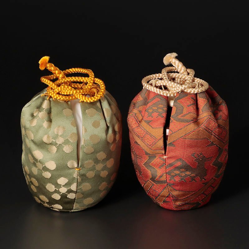 共箱/二重箱/而妙斎書付/栞/仕覆2枚(画像左:利休梅緞子、右:有栖川鹿文緞子) |