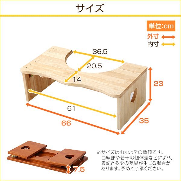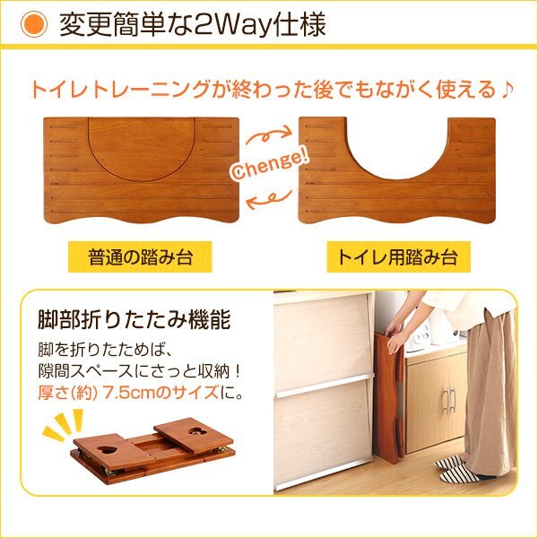 | 【ポイント】 ①トイレ用&一般的な踏み台として使える、こども踏み台です。 ②静止耐荷重(約)80㎏の丈夫な天然木製です。 ③安心を追及して角を丸く加工しています。 ④折りたためば省スペースで収納可能です。 ⑤組み立て要らずの完成品♪ |