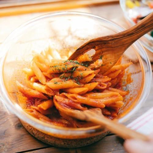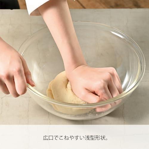 浅型の広口設計なので、こねたり混ぜたりなどの下ごしらえがしやすく、電子レンジやオーブンの調理ができる耐熱ガラス製です。