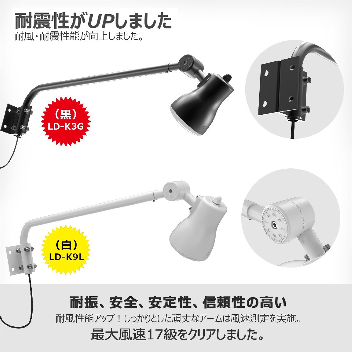 ★オススメポイント★ 1灯2色 電球色・昼白色 切替式 2種類の色温度で設置可能です。 アームの切替スイッチで簡単に変更できるため、様々なご利用シーンに適用します。 (1)5000K(昼白色):街灯、駐車場.倉庫夜間常用照明等! (2)3000K(電球色):店舗の看板、広告看板、壁面看板、広告壁などの看板照明用等! 優れた鉄材を採用!耐振動設計のため、強風にも耐えられる! さらに塗装加工で、耐腐食性能を高め、錆びにくいですので、屋外でのご利用にもおすすめです。 設置簡単:LED灯具+配線+L字アーム+壁面取り付け用金具を組み立てた状態でお届け! 電源線収納可能 アームの中に投光器の電源線を通し、電源コードをスッキリ収納できます。 様々な設置方向適応可能です。 アームを様々な方向に設置できるため、施工条件に合わせた取付方法が選択できます。 静荷重試験による検証が実施済みです。 最大「風力階級17」相当の57m/s風速に耐えられますので、安心・安全に使用できます。 ※静荷重試験とは、一定荷重あるいは一定変形毎に加力を止め各部のひずみや変形の度合いを測定するものです。 様々なシチュエーションで使えます。 ・屋内外のサインボード、店舗の看板、広告看板、壁面看板、広告壁などの看板照明用。 ・展示会場・施設・建物の景観維持にもおススメです。 △ご注意△ 必ず垂直な壁面につりつけて使用してください。 特に灯具側が下がった状態で使用すると、灯具内に浸水してしまう可能性があります。 アームの施工は市販のワイヤーで補強してください。 |