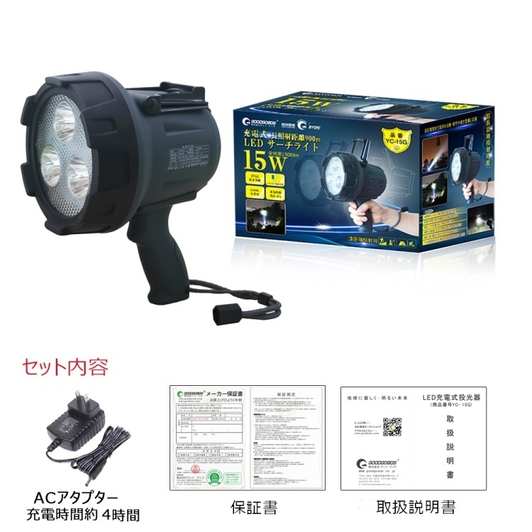 | セット内容 | サーチライト本体(ストラップ付属)、AC充電器、保証書、取扱説明書 | ||