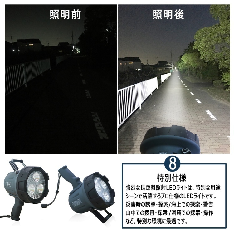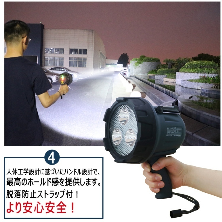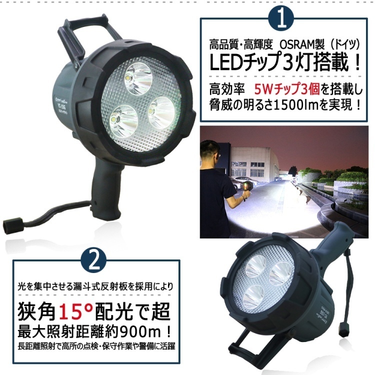 | ★オススメポイント★ 最長照射距離約900m、超遠距離タイプの登場! 光を集中させる漏斗式反射板を採用により、狭角15°配光で超遠距離900m付近まで到達! 充電式・コードレース! 電源の取れない場所でも大活躍! 点灯時間最長8時間!夜間作業を強力サポート! 多機能設計! 折り畳み式ハンドル・グリップ・ストラップ・三脚取付穴付 使用場所によって手持ち・手提げ・吊り下げが可能! 市販の三脚にも対応! グリップの滑りにくく持ちやすい形状に加え、僅か0.7kgの重さで扱いやすい設計 ※三脚は付属しておりません。別途お買い求めください。 高品質・高輝度 OSRAM製(ドイツ)LEDチップ3灯搭載! 高効率5WLEDチップ3個を搭載し、脅威の明るさ1500lmを実現! スイッチ一つで点灯4モード切替可能! HIGH・MIDDLE・LOW:用途・場所などによって使い分けが出来る SOS:モールス信号のSOSサイン もしもの時に! 点灯パターンHIGH→MIDDLE→LOW→SOS→OFF バッテリー残量計付 電池残量がひと目で分かり計画的にご利用頂けます。 表示は25%、50%、75%、100%の4段階です。 LEDランプの点灯数で電池残量が一目で確認できます。 本体にUSB出力口付、モバイルバッテリーとしても利用可能! 照明ライトは勿論! モバイルバッテリー代りにもなる! 1台2役の優れものです! USB出力: 5V 1A 安心の防塵・防水設計! IP65防塵防水仕様となっており、突然の雨も安心! 雨の当たる屋外や粉塵の多い環境でも安心・安全にご使用頂けます。 使用範囲 鉄道・海上作業·救援・自衛隊町内会など緊急事態の誘導照明などとしてお役立て致します。 高所・下水道・鉄道・地下鉄・トンネルなどの点検作業 灯台・漁船の信号灯としてもお勧めです。 |