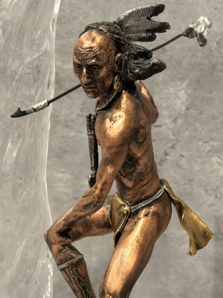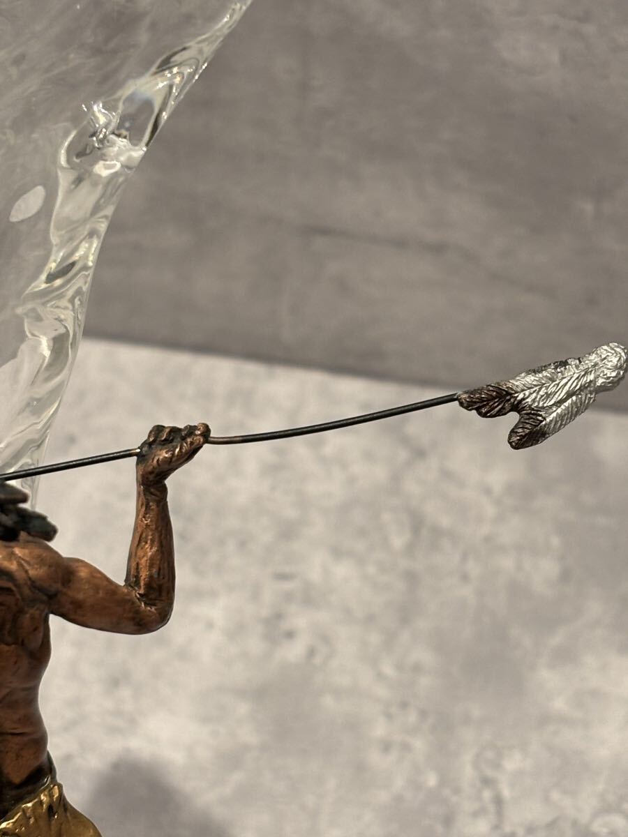 激しい滝の流れをクリスタルで表現し、その前に立つネイティブアメリカンの姿が、