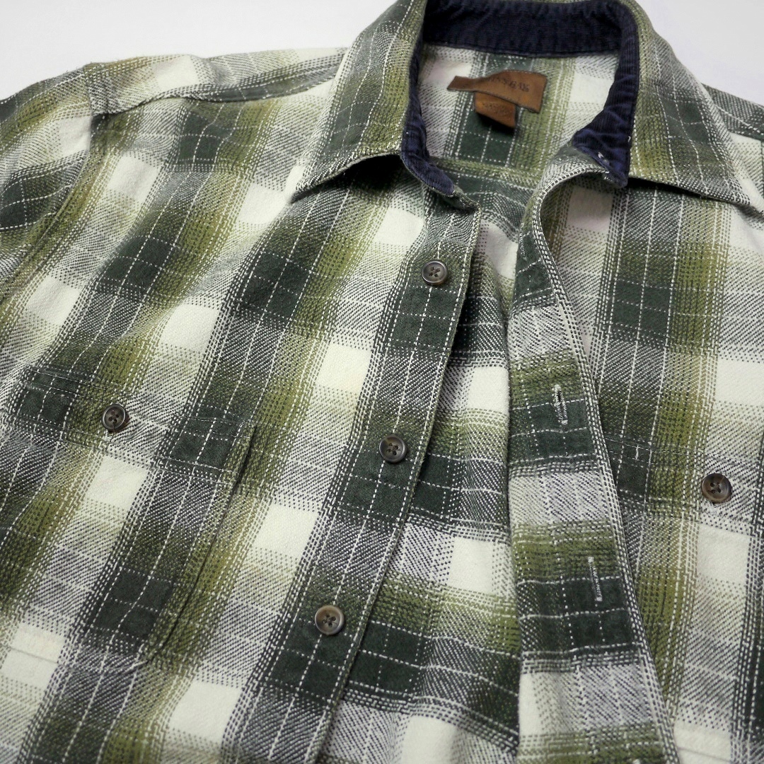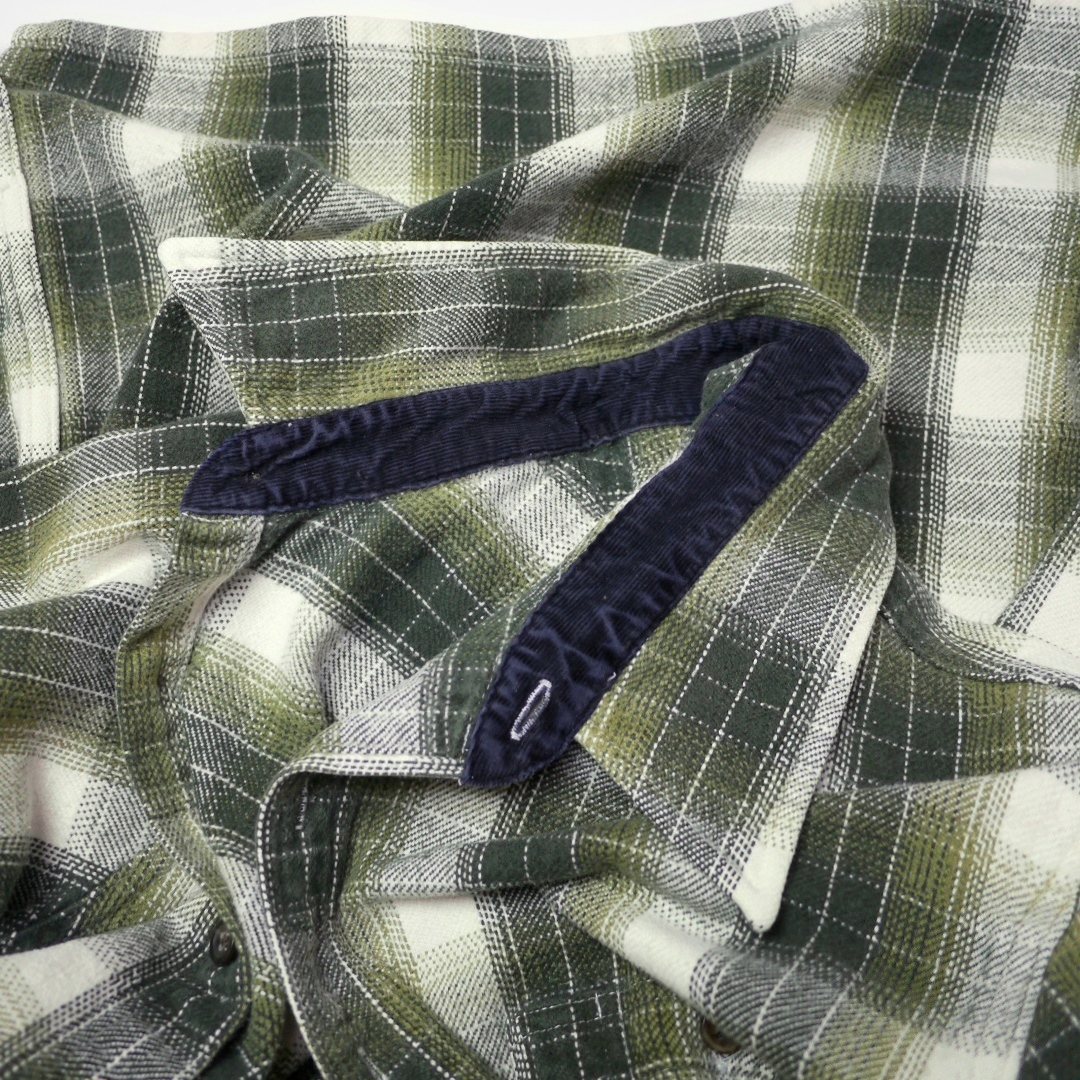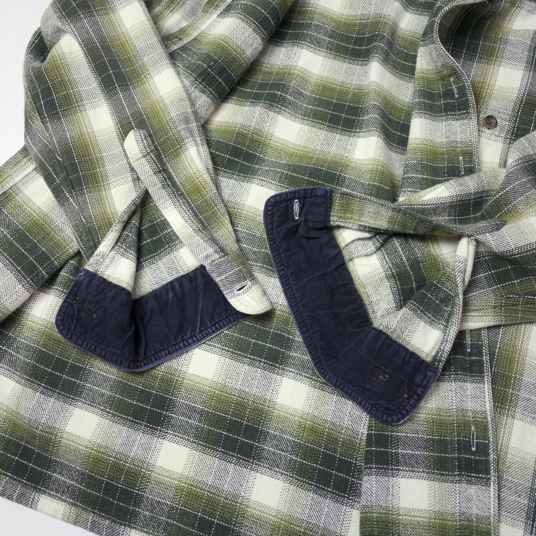 ■ブランド 00s、STJOHN’SBAY ■カラー ボディ=オリーブグリーン、ダークグリーン、ホワイト系 コーデュロイ=ネイビー ■素材 100%COTTON ■詳細 アメリカで購入したセントジョンズベイのヘビーネルシャツです。 00年代ごろのアイテムで玉数の多くないボックスシャツのタイプになります。 生地はオールコットンフランネル、厚みのあるガッシリとした生地感です。 人気のヘビネル、レアなオンブレ系チェックでカラーリングもイイ感じです!! ■状態 コットンネル特有の毛羽立ちと毛玉、コーデュロイの畝(袖先フチ、台襟先)に摩耗、ほぼ分かりませんが第三ボタン左付近(白地)に薄染みあり。 着用に問題あるダメージはなく良好です。 ■サイズ 表記 M (着用感M相当、肩幅身幅は大きめの作りです *実寸参考下さい) 着丈 71cm 肩幅 49cm 身幅 55cm-57cm サイドプリーツあり 裾幅 57cm 裄丈 82cm 脇袖丈 49cm 肩袖丈 58cm ■注意事項 状態は細かく確認しておりますが、傷や汚れの見落とし、実寸誤差、色味差異など生じる場合がございます。 不明な点がありましたら入札前にご質問下さい。 商品にあわせて洗濯やクリーニングメンテナンスを施しておりますが、ビンテージやアンティークなど中古品になりますので特性のご理解をお願いします。 |