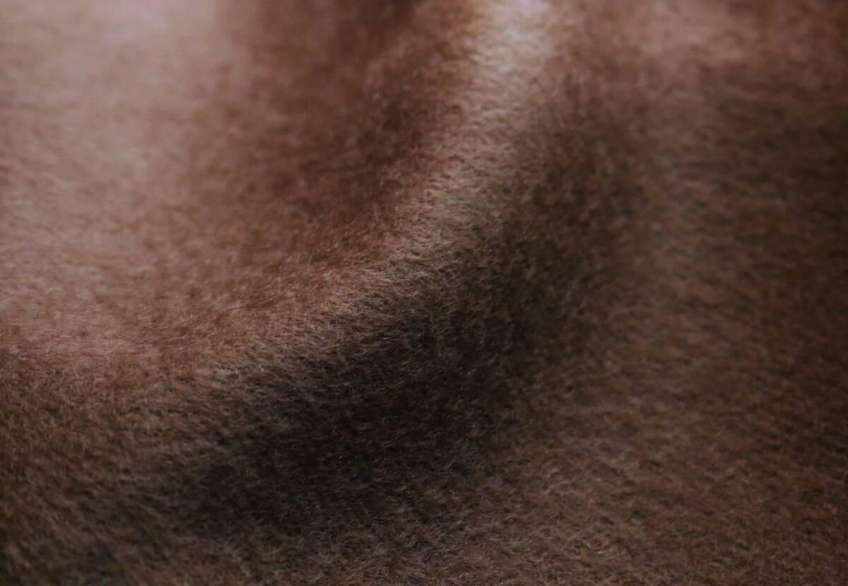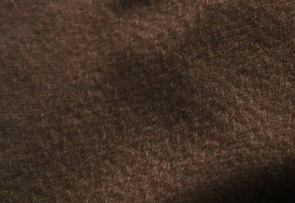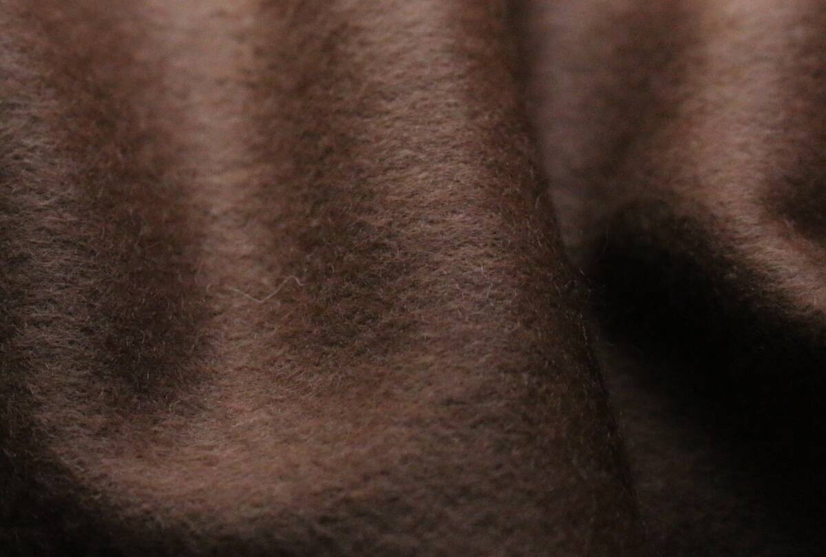 仕上げに、棘があるティーズル(あざみ)の実(画像に映っているブランドタグにもある、ブランドロゴにも使われています)を使い、生地表面を優しくブラッシングすることで、美しいうろこ状の毛並みと上品な光沢感、角度を変えると見えてくるさざ波の様な表情を実現しています。