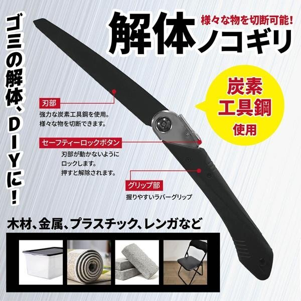 | 粗大ごみの解体やDIYに! 様々なものを切断できる、炭素工具鋼刃の折りたたみ式ノコギリです。 ■ 強力な炭素工具鋼を使用 ・・・様々な物を切断できます。 ■ セーフティーロックボタン搭載 ・・・刃部が動かないようにロックします。 ■ 握りやすいラバーグリップ ■ コンパクトに折りたためる 木材・金属・プラスチック・レンガなどザクザク切れる! 廃棄物をコンパクトに! 大型ゴミを細かく切断すれば、小さく処分できます。 収集場所まで運ぶのにもラクラク♪ 趣味のDIYにもおすすめ! このノコギリ1つで様々な物を切れるので、材質によって道具を変える手間がありません。 災害時・非常時にもあると便利です。 |
