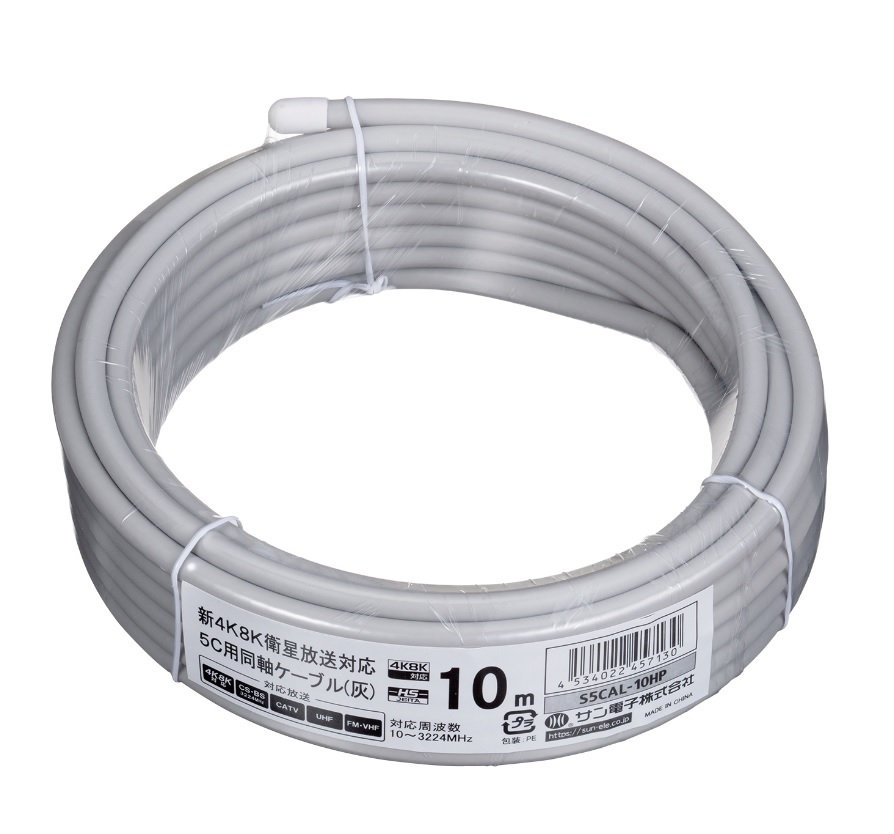 (10mケーブル・ラップ巻き梱包仕様) 5cケーブルを採用、アルミ編組を使用したシールド構造により、外来電波の混入を防ぐ高シールドタイプです。(カラーは灰色)