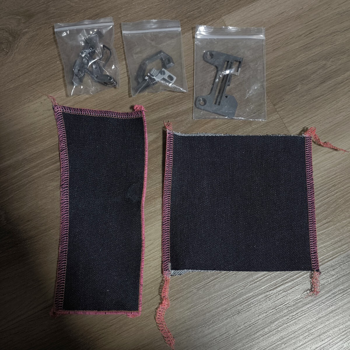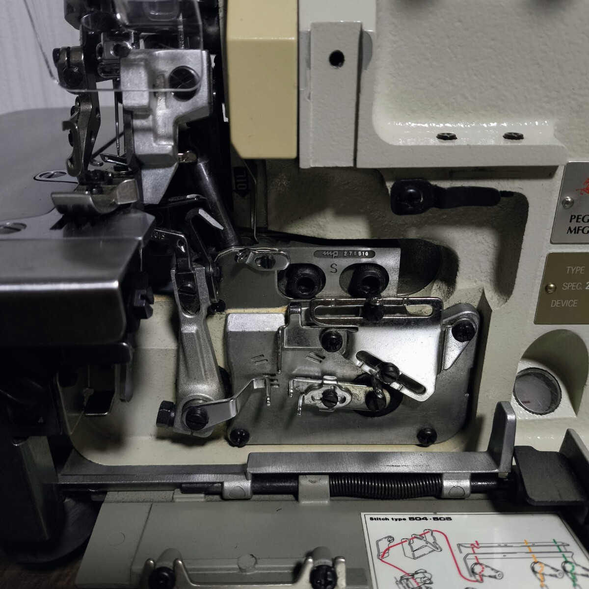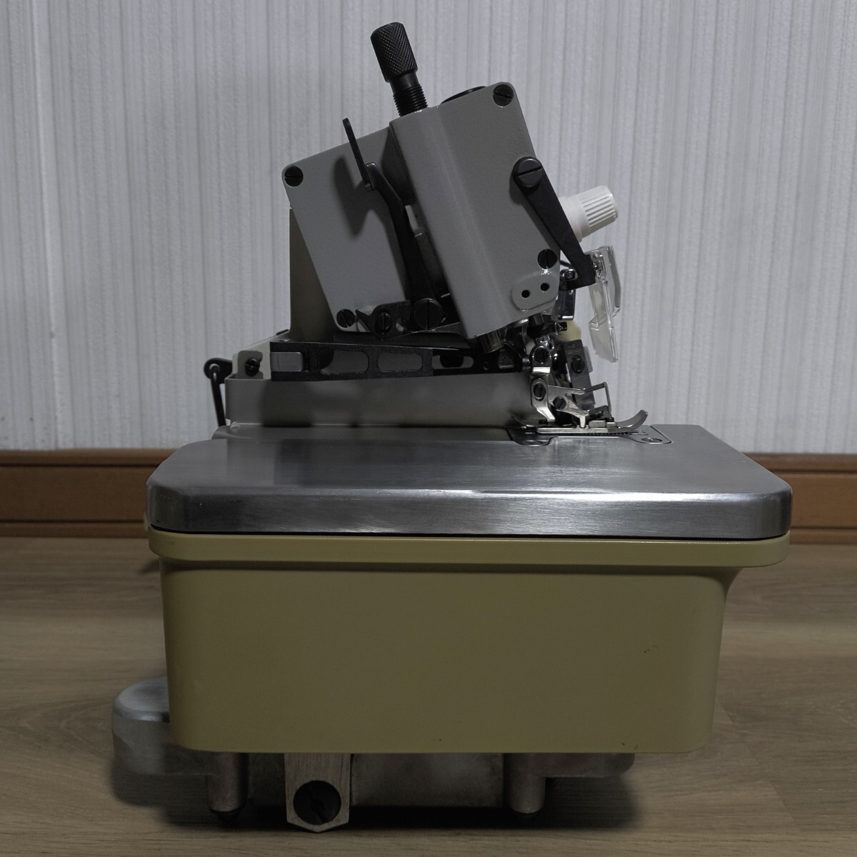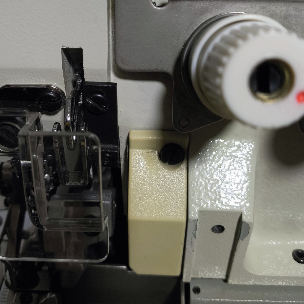 もともとは1本針3本糸オーバーロックでしたが2本針4本糸オーバーロックに変更してあります。メローロック(巻きロック)用のゲージセットですので変更すればメローロックミシンとしても使用できます。