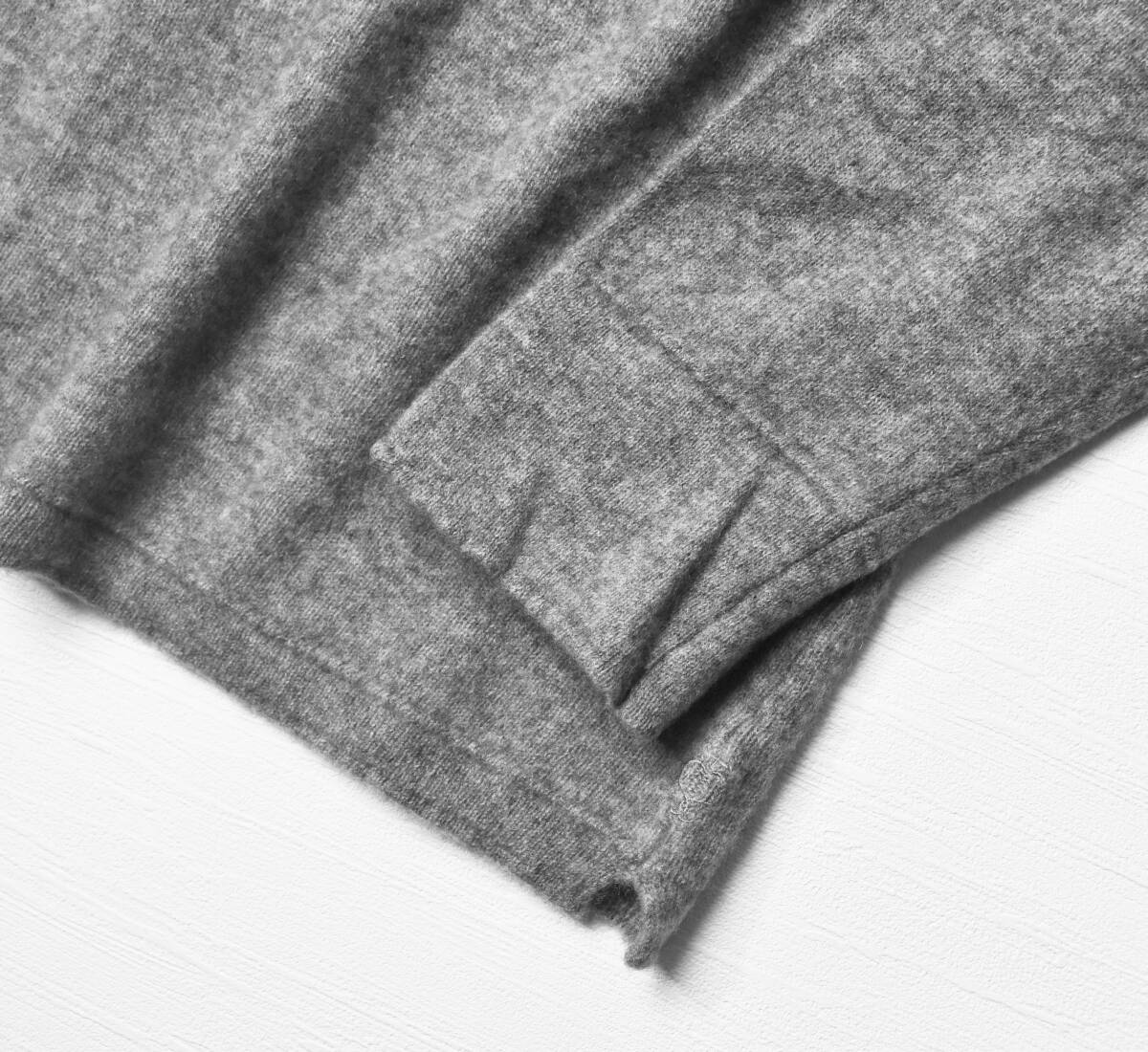 もちろん肌触りも格別。極上のカシミアタッチが味わえます。 表面がふっくらと起毛している(薄い起毛で覆われている)ので、秋冬らしい温もりがあり、やさしい風合い。 最高級カシミアが持つ手に残るようなヌメりがあり、 とろけるような柔らかさに加え、体を包み込む安心感と暖かさに満たされます。 フワッと身体を優しく包み込む極上の質感と至福感。そして着ていることを忘れてしまうほどの 軽やかさは、こちらのカシミアのみに与えられた特権となります。 これ以上ない¨ふわトロ感¨がありながらも、ツヤのある質感も残っており、目が詰まっているので耐久性も◎。 中国カシミアのような糸量少な目のスカスカ感はありません。