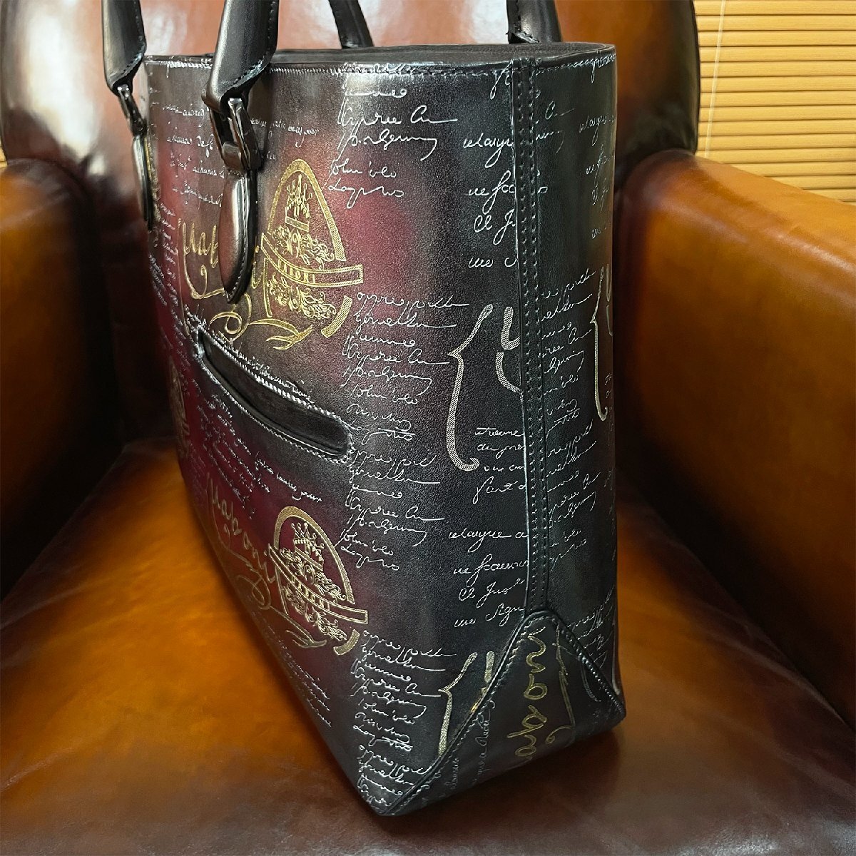 手触り感触が良くアンティーク風なトートバッグと仕上がりました。角の部分は丸みを帯びた設計になっており、全体的にカリグラフィーとゴールデン/シルバーパティーヌがデザインされております。色艶、柔かさに優れていて高級感溢れる逸品となります。