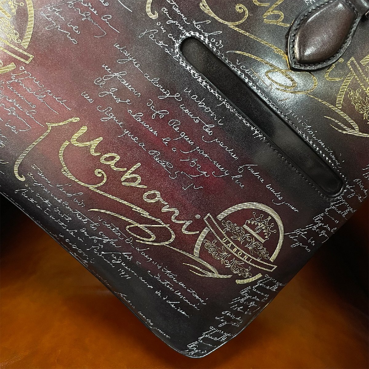 染料の開発成功は製作の一番重要な問題の解決に繋がり、職人が一つ一つの工程にこだわり作り上げた牛革トートバッグです。一番こだわりの工程はカリグラフィーの彫り込みと革の着色です。