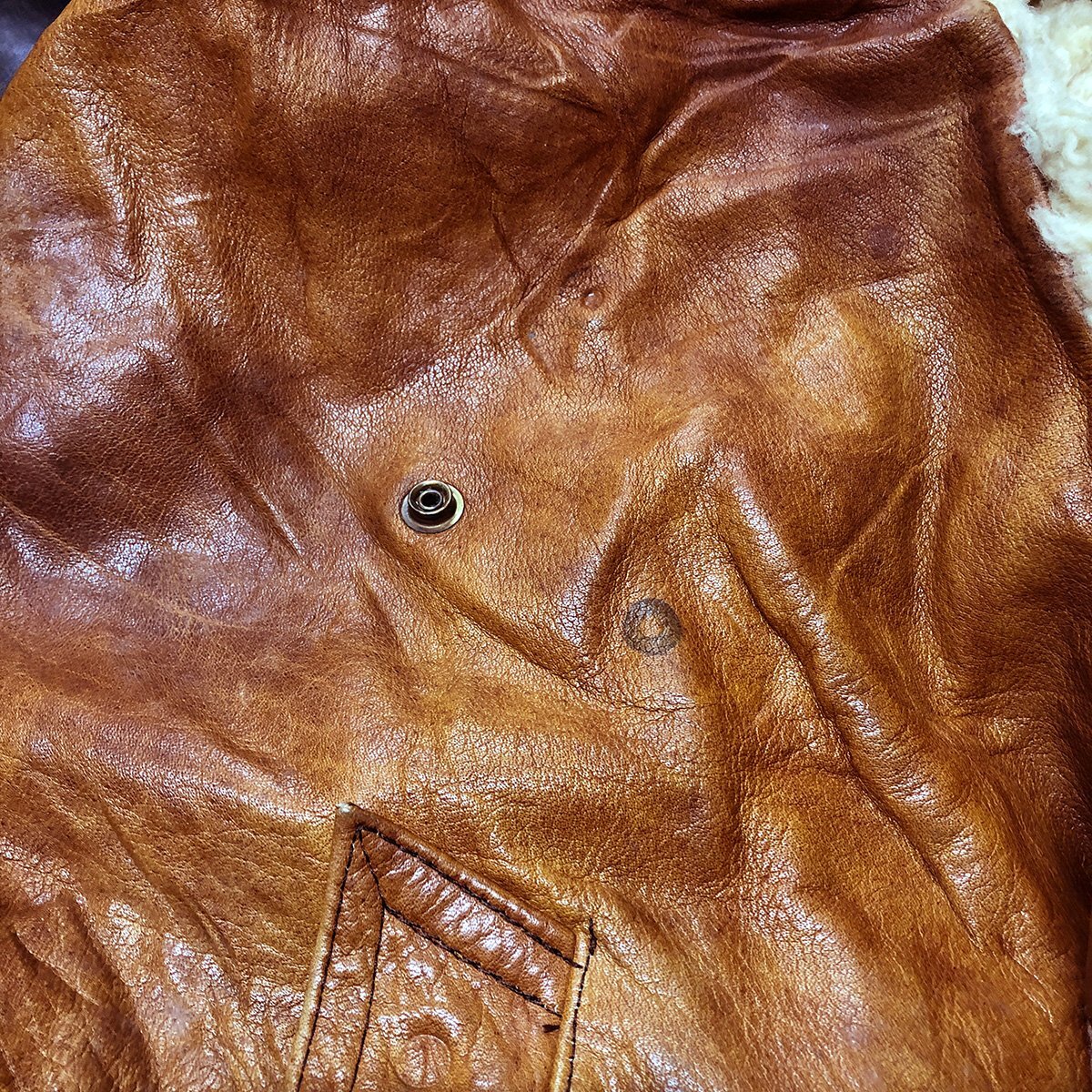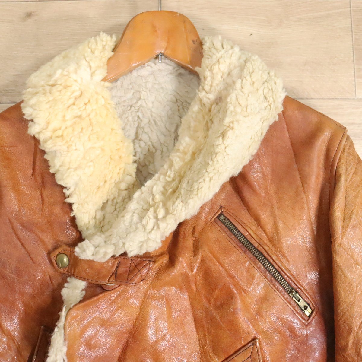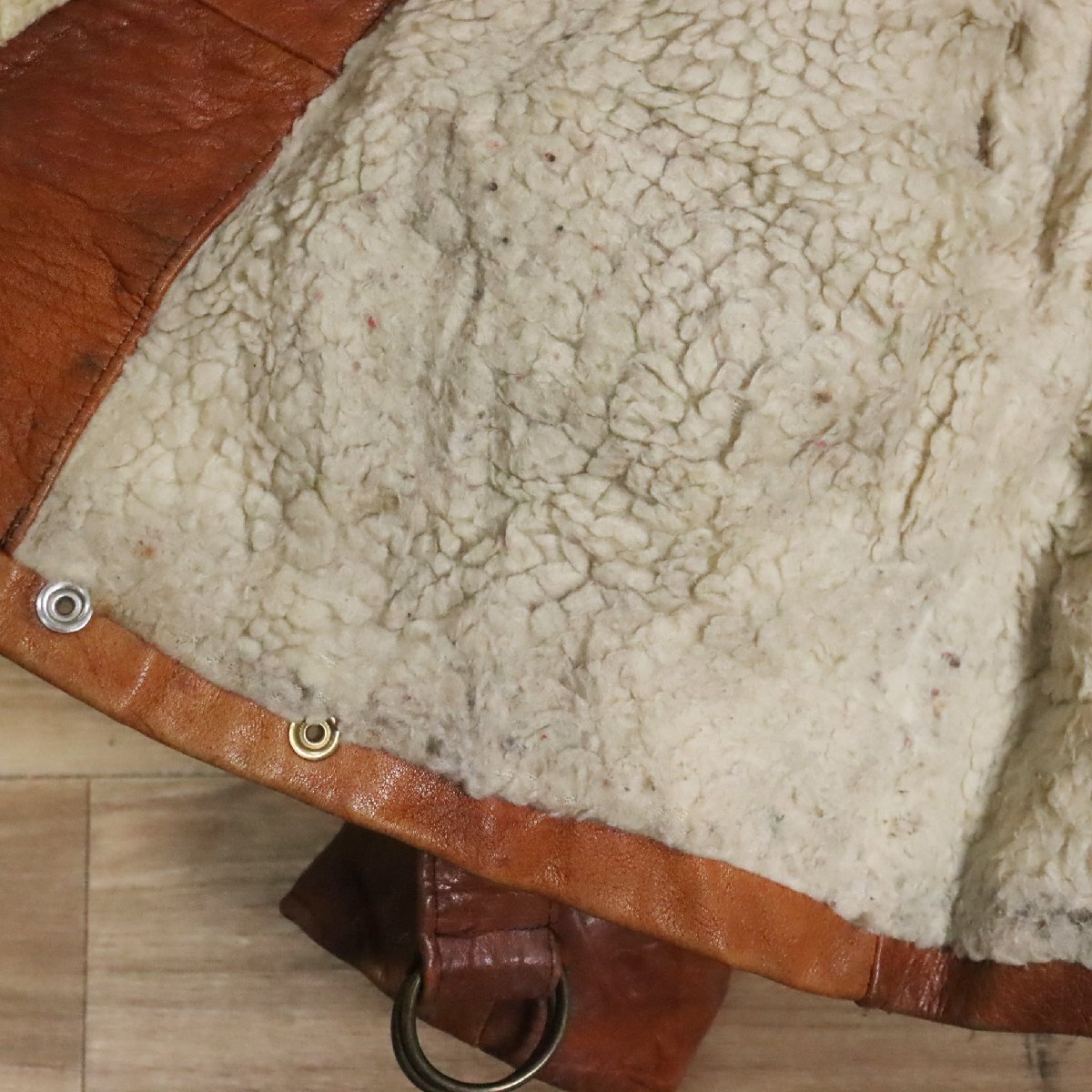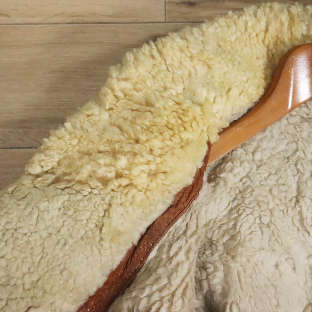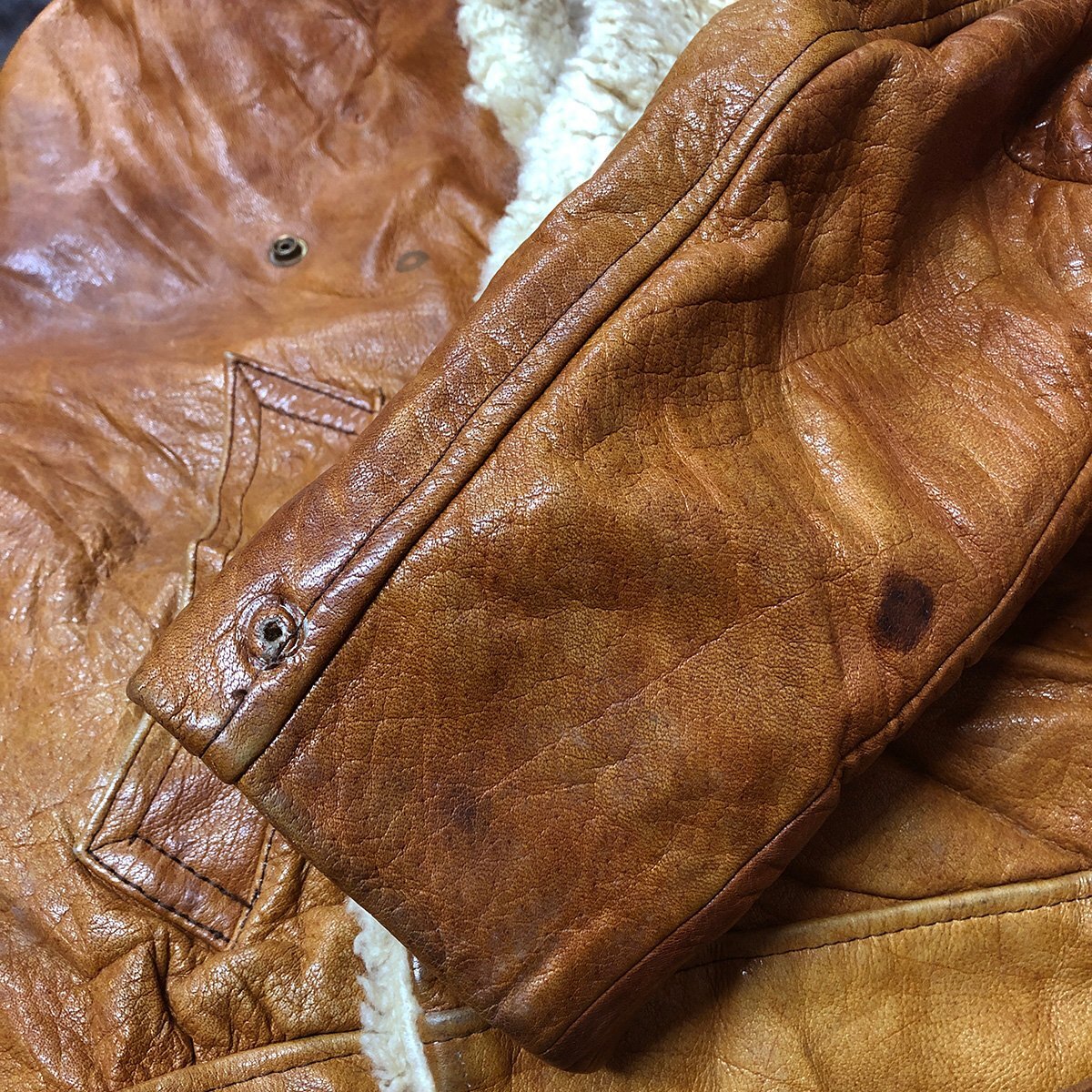 中古品です。使用感があります。全体的に経年による擦れや変色、胸や袖先などに汚れ、裏地全体に毛玉や薄汚れ、所々にボアの潰れや抜け、左袖先のスナップボタンがありません。