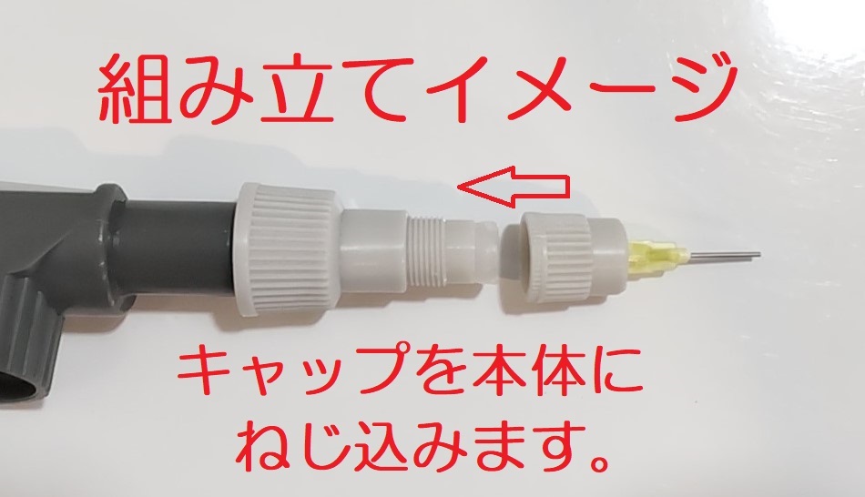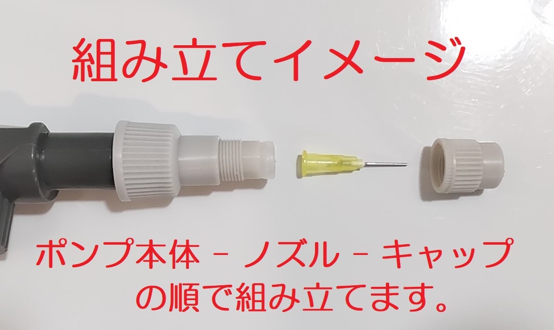 組み立て時は、キャップにノズルをセットして、ポンプ本体にねじ込んでください。(画像5~6枚目)