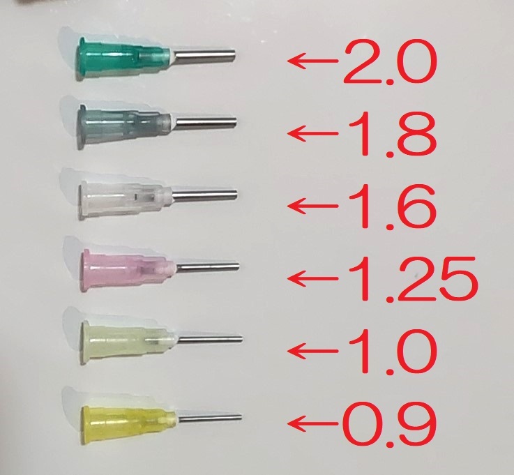 ノズルは2.0mm~0.9mmまでの先端が金属になっているものが6サイズが付属します。