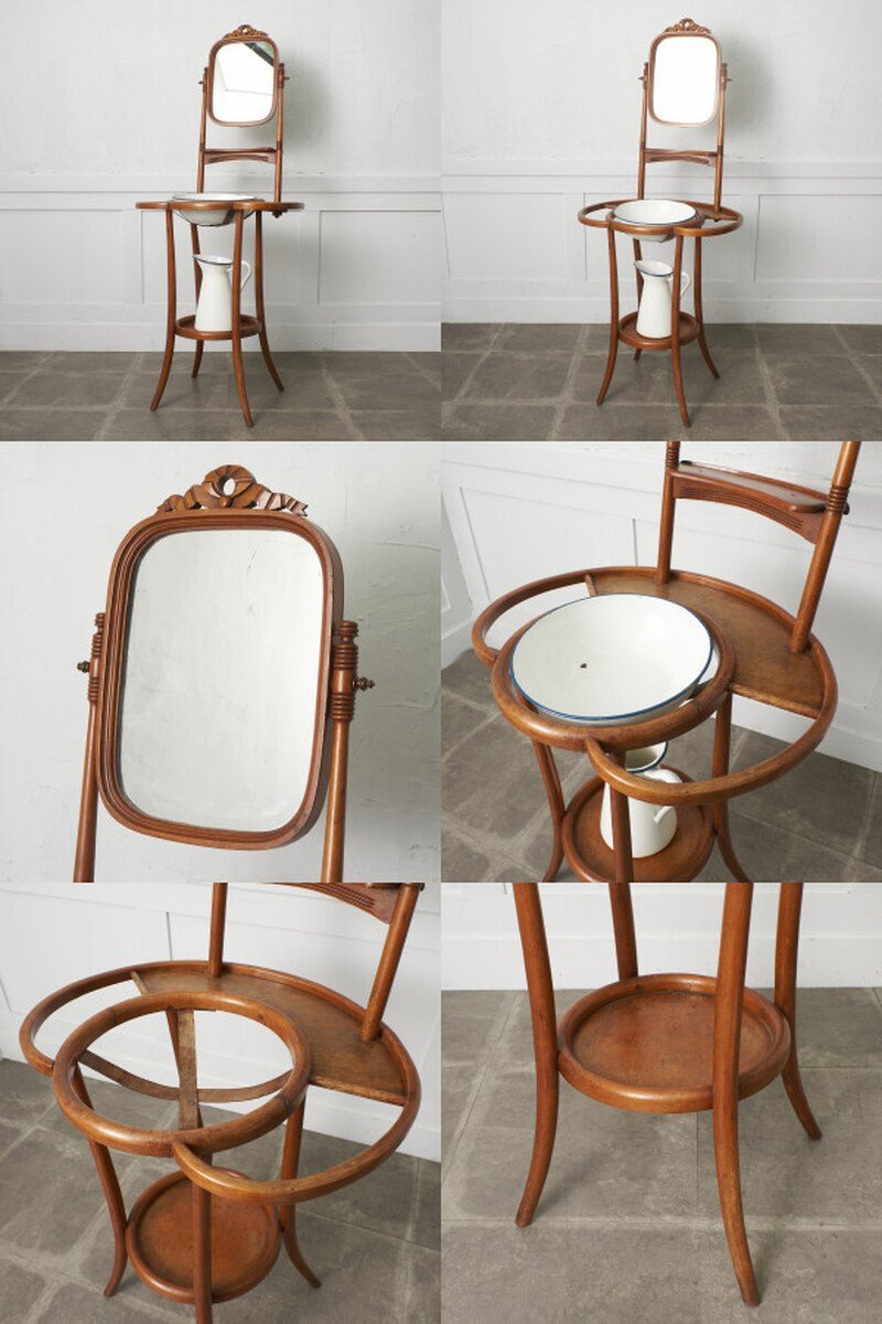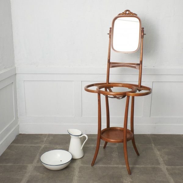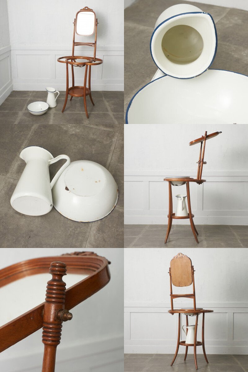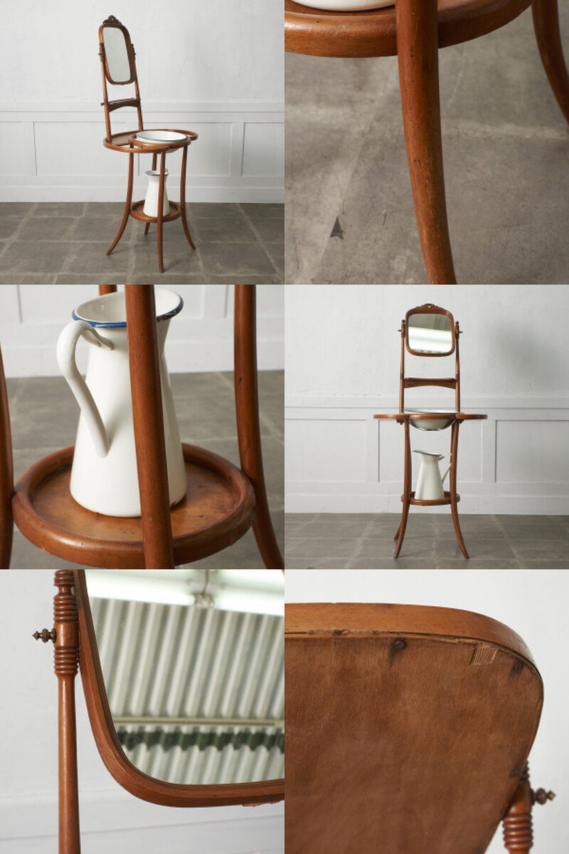 1世紀以上変わらない曲げ木の技術が用いられたクラシカルな佇まいが魅力のウォッシュスタンド。味わいのあるホーロー製のウォッシュボウルとジャグが付属され、年代物ならではの心地よい温もり、使い込まれて程よく古びた風合いが素朴で優しい雰囲気を演出します。ウォッシュボウルをセットしてご使用頂くのはもちろん、花台や店舗什器としても活躍してくれます。