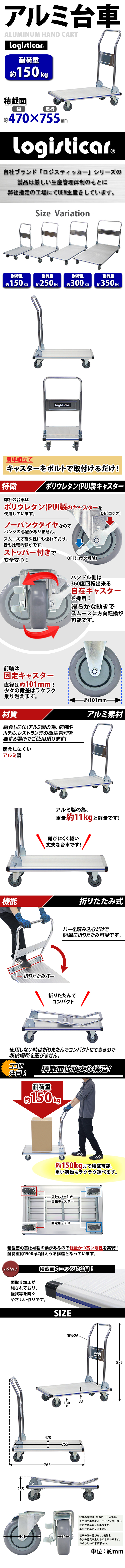| 商品名 | 送料無料 台車 アルミ台車 折りたたみ 耐荷重約150kg 積載面約470×755mm 平台車 大型台車 重量台車 台車 手押し台車 運搬台車 業務用 アルミニウム 軽量 頑丈 コンパクト 約47×75.5cm 食品 冷蔵倉庫 クリーンルーム daishaalumip150 |