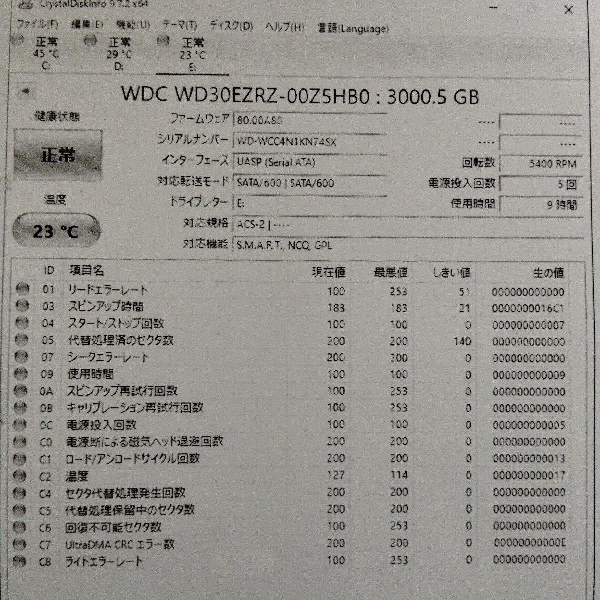 HDD 3TB 使用時間9H Western Digital WD Blue WDC WD30EZRZ-00Z5HB0 ハードディスク 正常 #091
