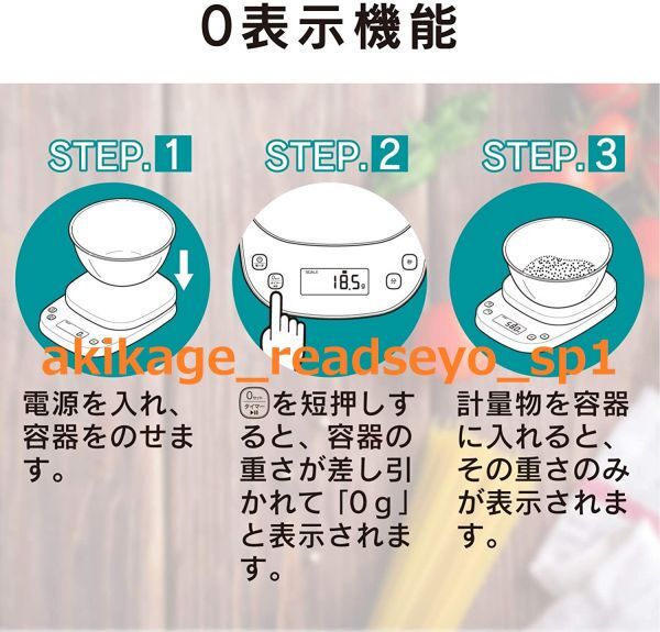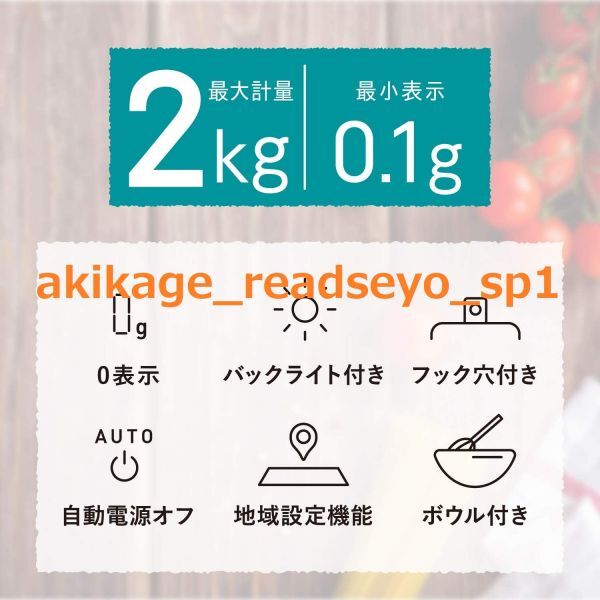 *計量精度は、0.3~200gの場合±0.2g、200~1,000gの場合±2g、 1,000~2,000gの場合±3gです。 *ボウルに入れて計量物を量る際、ボウルを乗せ0gセットボタンを 押すことで容器の重さを差し引くことができます。 *無操作状態で約2分経過すると、自動的に電源がoffになります。 *仕様 計測範囲 : 0.3~2,000g 最小表示 : 0.3~200g:0.1g単位、200g~2,000g:1g単位 計測精度 : 0.3~200g:±0.2g、 200~1,000g:±2g、 1,000~2,000g:±3g 地域設定 : あり(9拠点) 電源 : DC3.0V 単4形乾電池×2本 自動電源オフ : あり(約2分間) 寸法 : 約幅140×奥行190×高さ30mm(ボウル含まず) 質量 : 約250g(ボウル、乾電池含まず) ボウル耐熱温度 : 110℃ ボウル耐冷温度 : -40℃ 精度保証環境温度 : 13~33℃ カラー : ピンク 内容物 : 本体×1、取扱説明書×1、 お試し用乾電池(単4形2本) 保証期間 : 1年間 計量法 : 家庭用特定計量器 丸正マーク 食品衛生法 : 対応 *付属品 : 本体×1、取扱説明書×1、お試し用乾電池(単4形2本) ※画像に掲載の食品やキッチン用品のような物は付属致しません。 キッチンスケールと上記記載の付属品(製品の元袋や元箱有)のみの発送です。 キッチンスケール