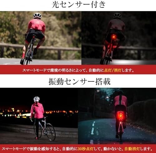 【自動点灯&光・振動センサー】自転車テールライトに光センサーと振動センサーが内蔵され、光の明暗に応じて自動点灯ができます。スマートモードで環境の明るさによって、自動的に点灯/消灯します。また振動を感知すると、自動的に30秒点灯、駐車して約30秒後に、テールランプが自動消灯します。