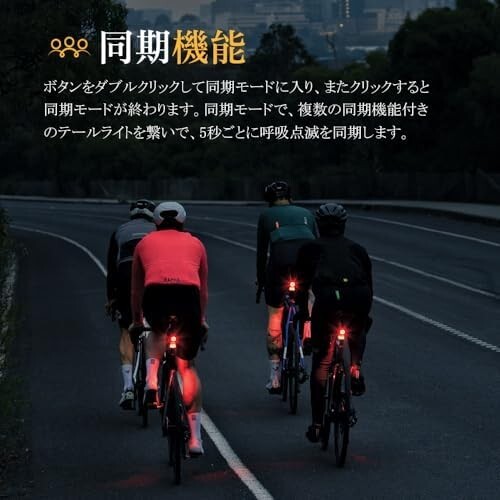 • 【同期機能】新しい技術で同期機能が搭載されています。スイッチをダブルクリックして同期モードに入り、またクリックすると同期モードが終わります。同期モードで、複数の同期機能付きのテールライトを繋いで、5秒ごとに呼吸点滅を同期します。チームライドに勢いを与え、走行の楽しさを増やします。