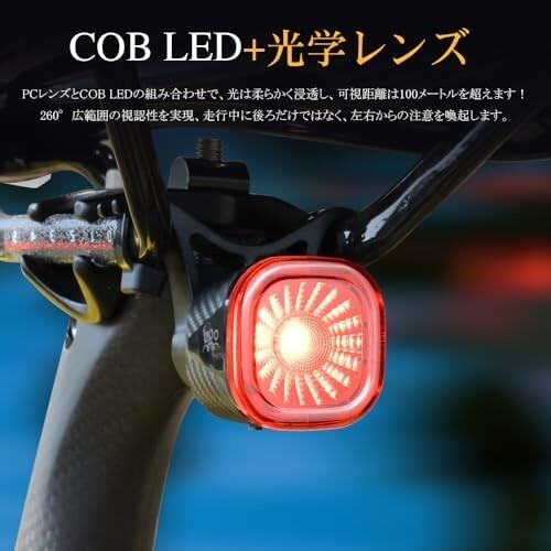 【COB LED+光学レンズ+IPX6防水】PCレンズとCOB LEDの組み合わせで、光は柔らかく浸透し、可視距離は100メートルを超えます!260°広範囲の視認性を実現、走行中に後ろだけではなく、左右からの注意を喚起します。IPX6の防水規格に達し、防水・防塵・防振性能を備え、悪天候でも信頼できます。わずか19gの軽量化を実現し。シートチューブ直径22mm~35mm以内に対応可能なシリコンホルダーが付いており、取付簡単、2種類の取付方法があり、大部分の車種に対応できます。