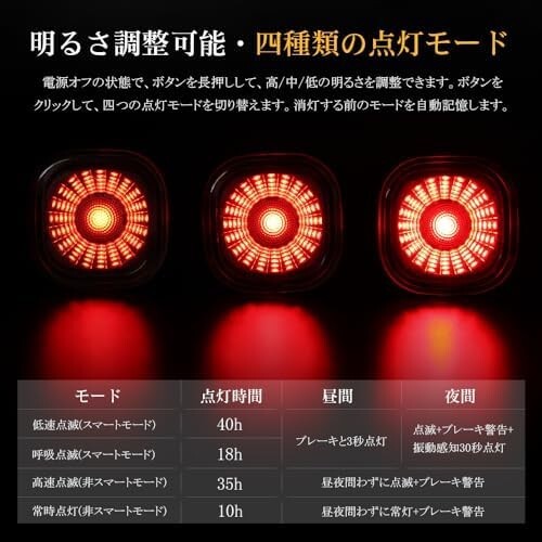 【明るさ調整可能・四種類の点灯モード】低速点滅、呼吸点滅、高速点滅、常時点灯の四つの点灯モードを選択可能。ボタンをクリックして、点灯モードを切り替えます。消灯する前のモードを自動記憶します。電源オフの状態で、ボタンを長押しして、高/中/低の明るさを調整できます。